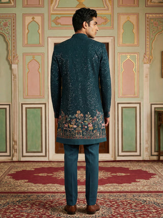 Men’s Peacock Blue Heavily Embroidered Indo-Western Set