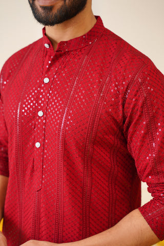 Men's Maroon Chikankari Embroidered and Sequence Kurta with Pyjama