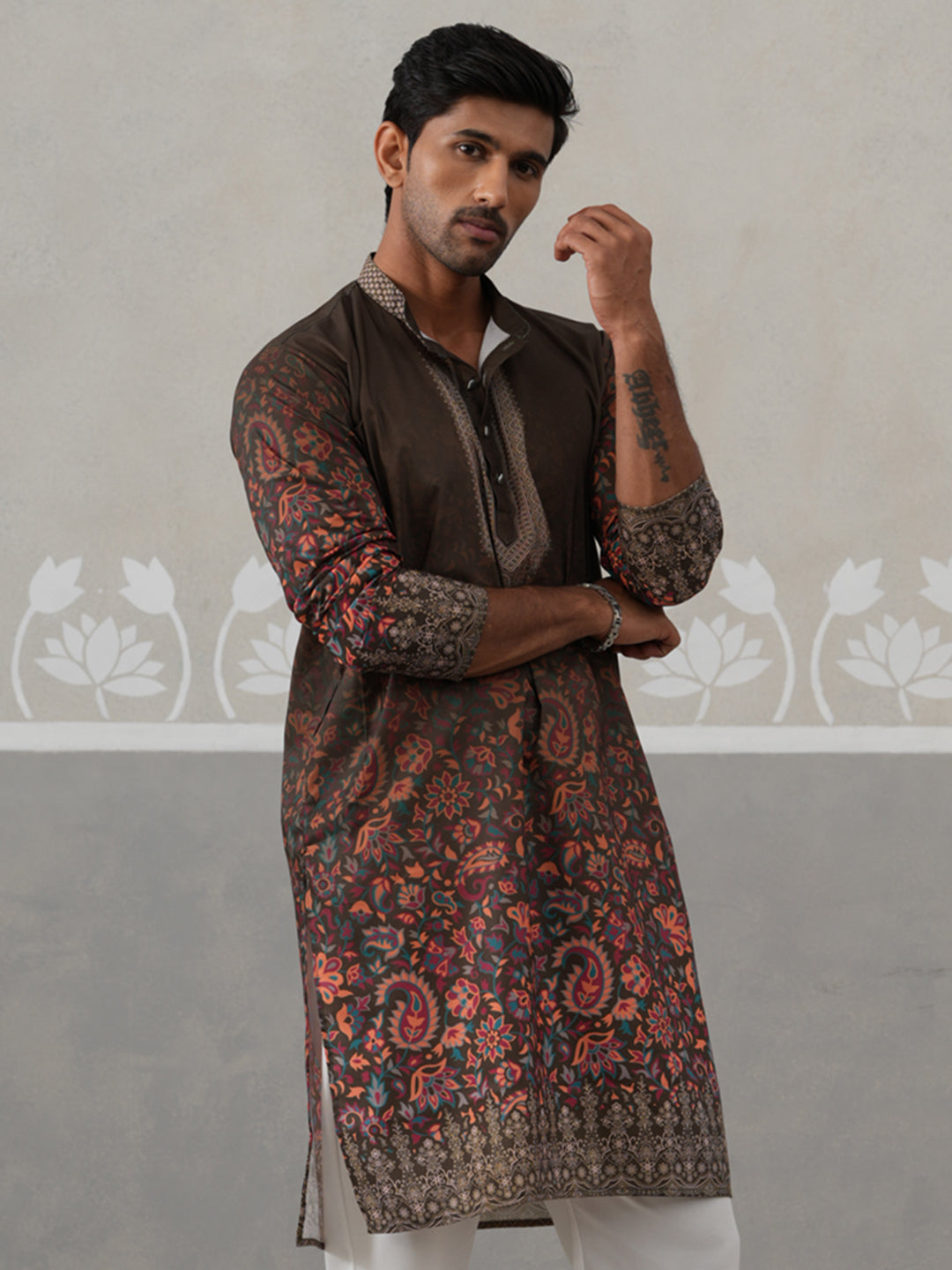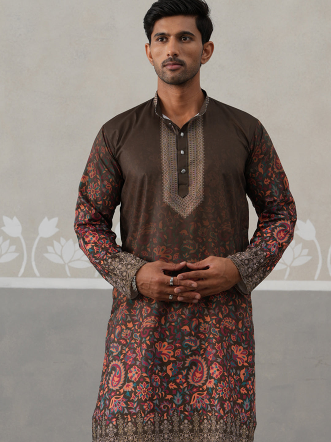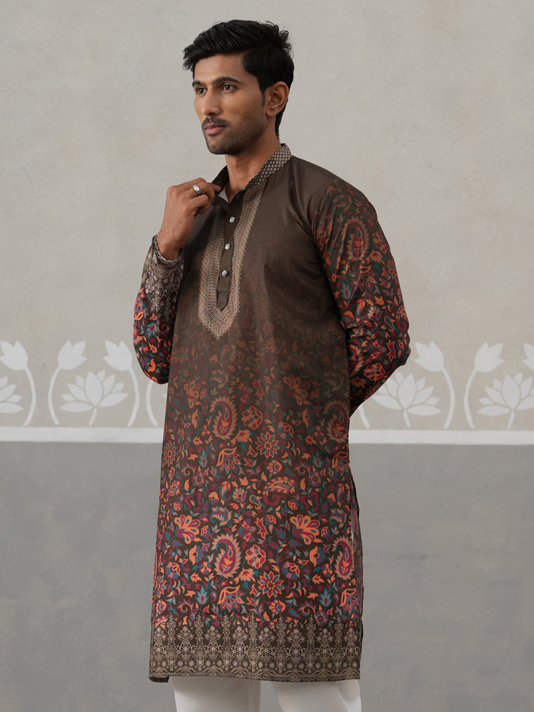 Olive Floral Printed Kurta for Men