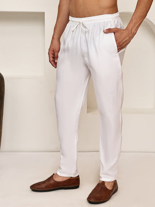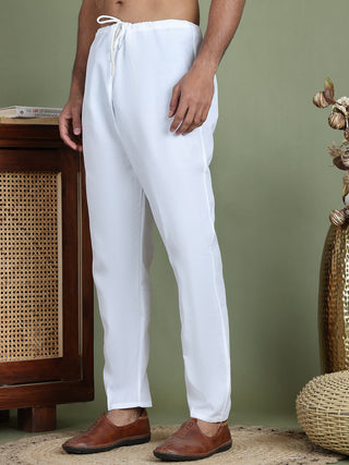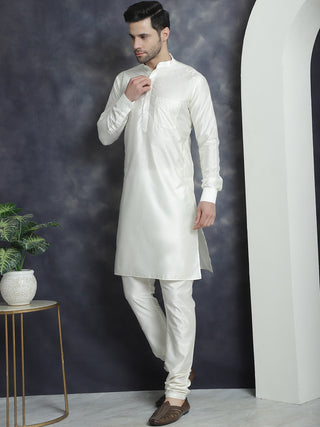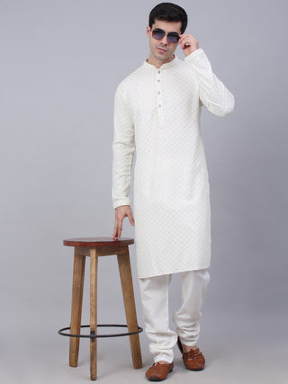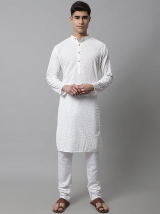 Men White Chikankari Embroidered and Sequence Kurta with Churidar