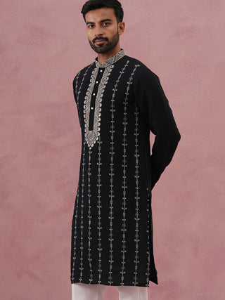 Black Silk Blend Kurta with Off White Geometric Embroidery