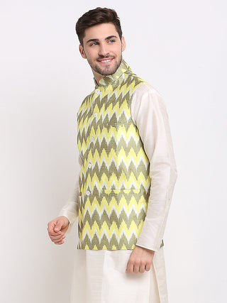 Jompers Men's Olive Ikat Printed Nehru Jacket
