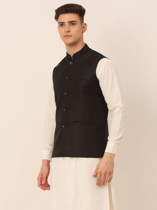 Men Black Solid Woven Sleeveless Nehru Jackets