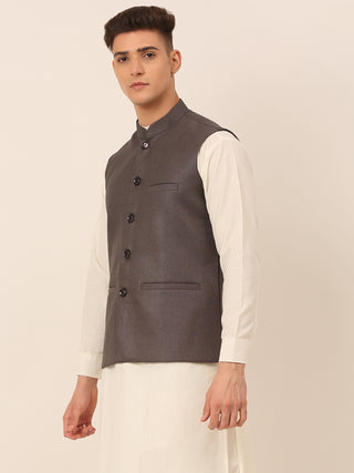 Men Charcoal Grey Solid Woven Sleeveless Nehru Jackets