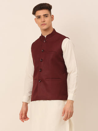 Men Maroon Solid Woven Sleeveless Nehru Jackets