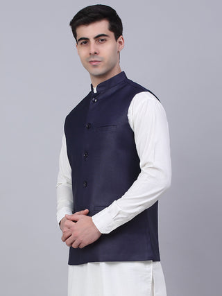 Men Navy Blue Solid Woven Sleeveless Nehru Jackets