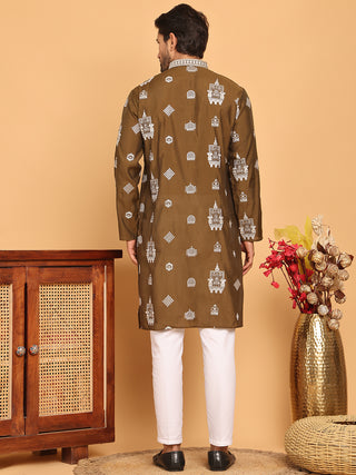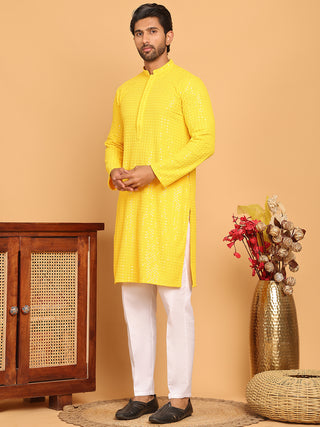 Jompers Men Mustard Embroidered Kurta with Pyjamas