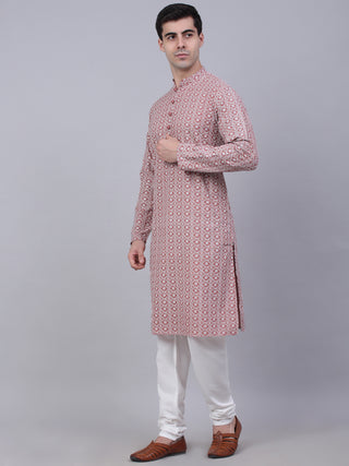 Men's Coral Red & White Embroidered Straight Kurta Pyjama Set