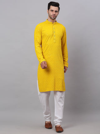 Men Yellow Chikankari Embroidered and Sequence Kurta with Churidar