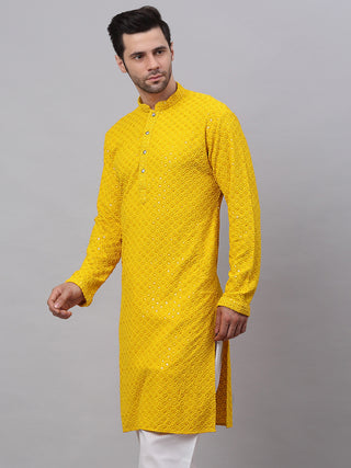 Men Yellow Chikankari Embroidered and Sequence Kurtas.