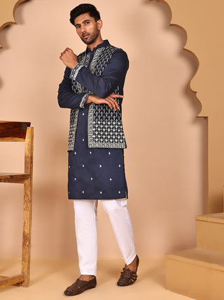 Men's Embroidered Nehru Jacket With Solid Kurta Pyjama Set.