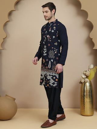 Embroidered Navy Blue Silk Blend Kurta Salwar and Dupatta Set for Men
