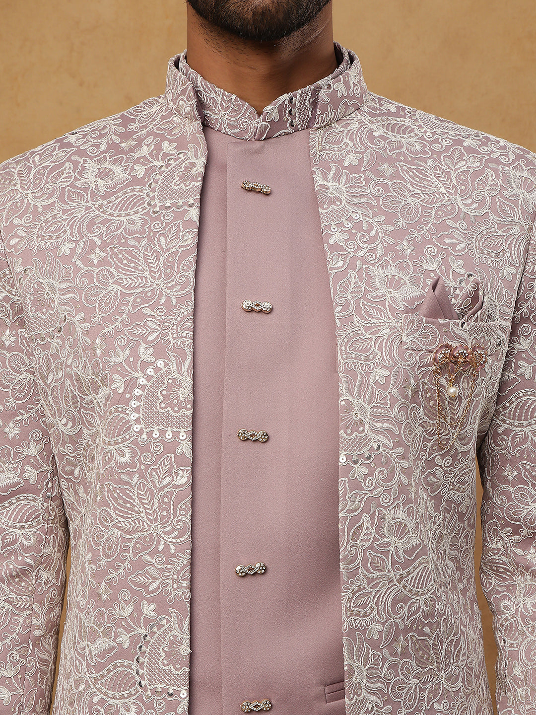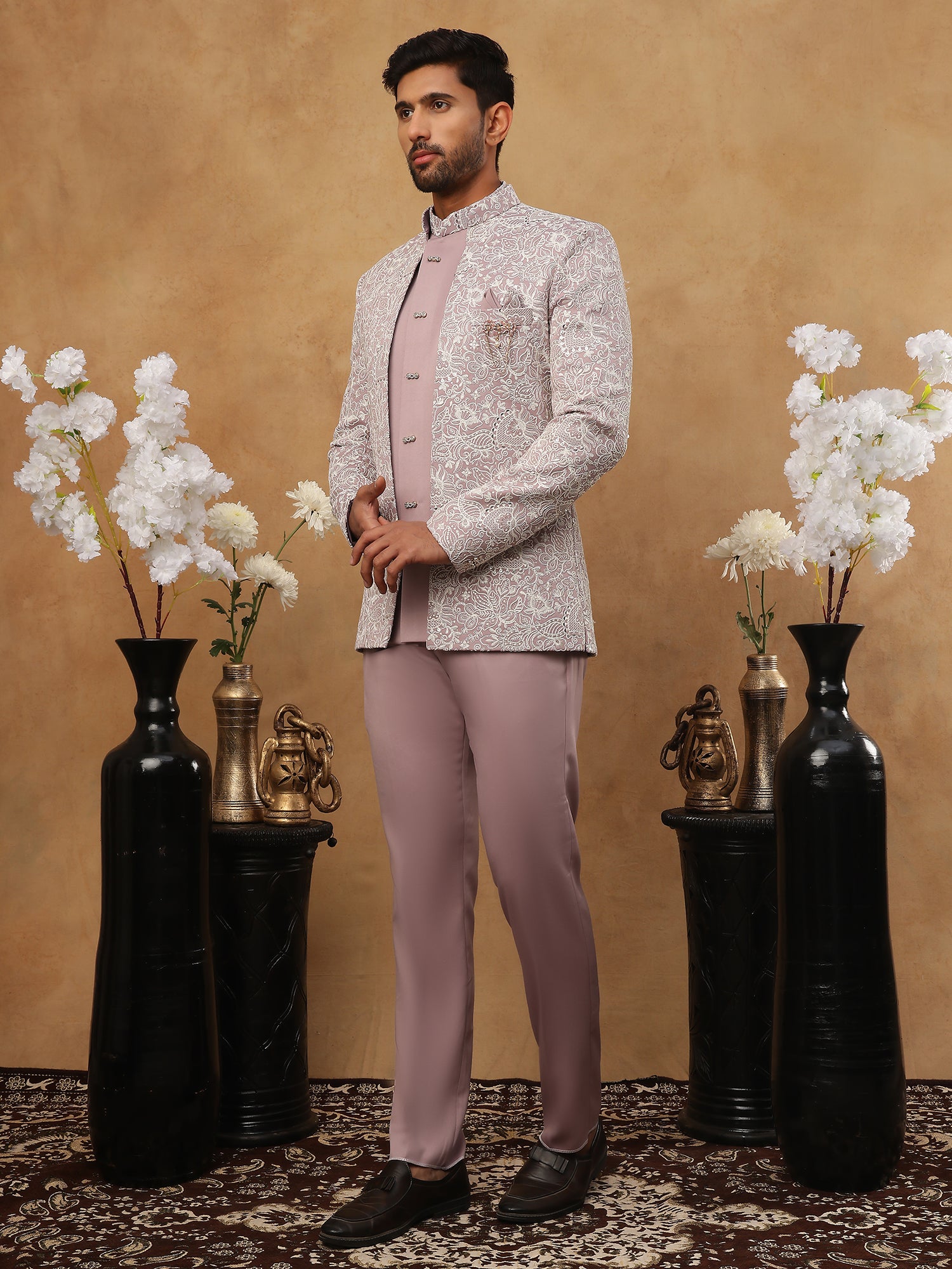 Elevate your ethnic wardrobe with this exquisite Lavender Indo-Western Set. Designed for the modern gentleman, this ensemble strikes the perfect balance between traditional elegance and contemporary fashion. The jacket is crafted from a premium Cotton-blend, ensuring you stay comfortable while looking effortless at weddings, receptions, or festive gatherings. The intricate white floral embroidery stands out beautifully against the soft lavender hue, while the solid matching trousers provide a sleek finish. Whether you are a groom, a groomsman, or a guest, this suit guarantees you will stand out in the crowd.