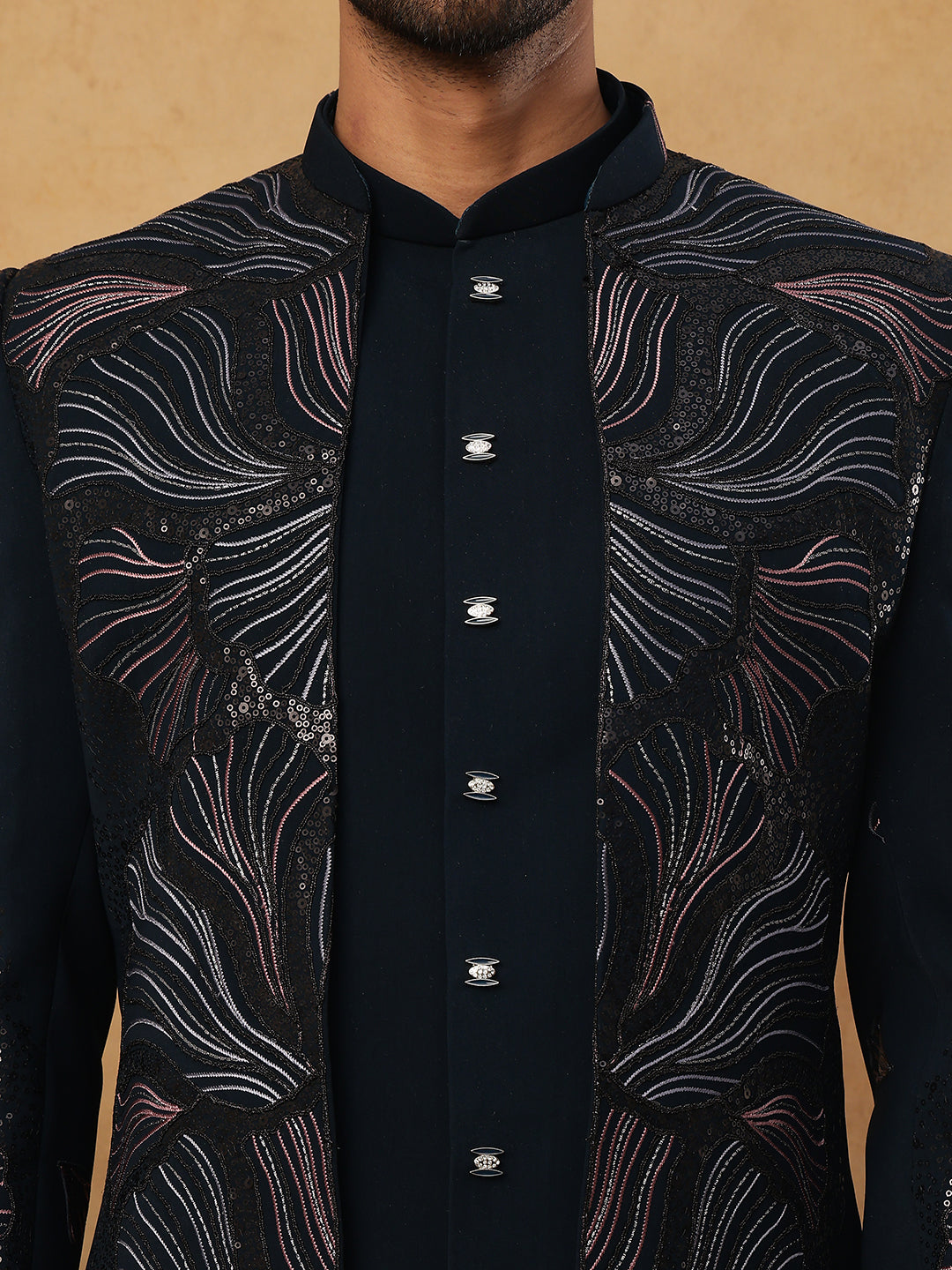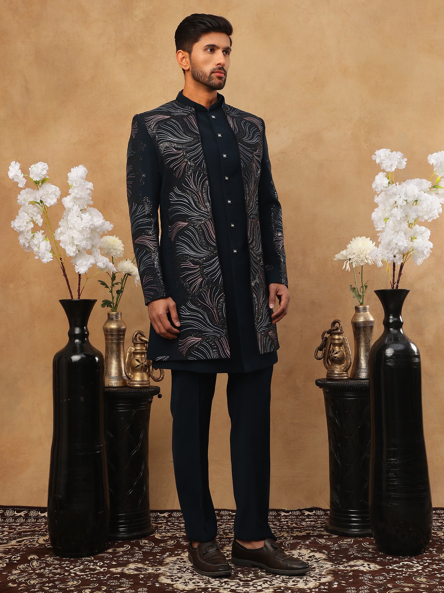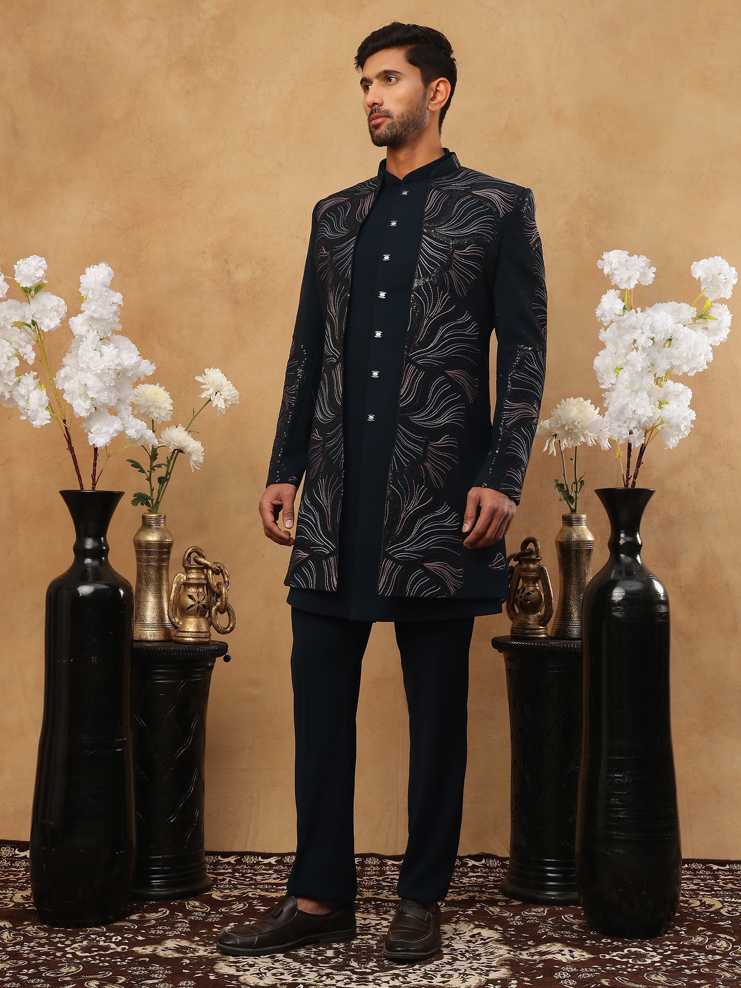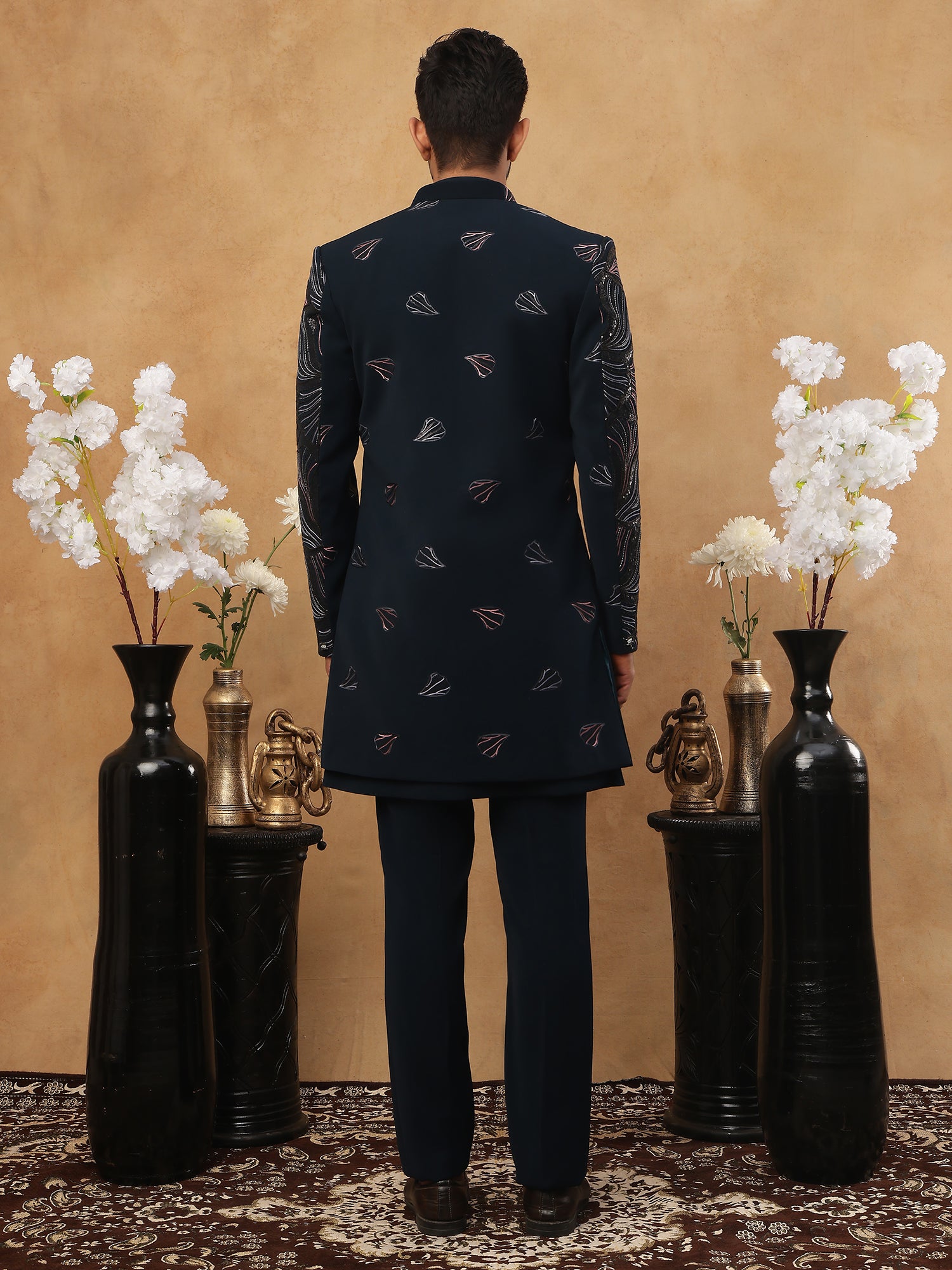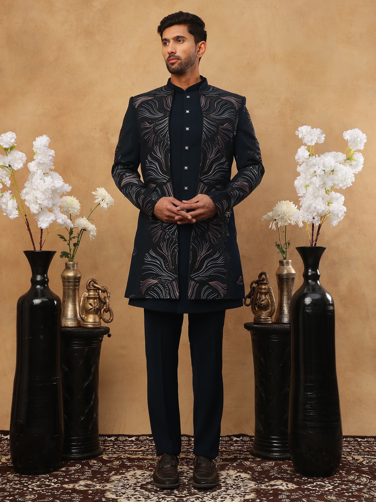 Make a powerful statement with this Navy Blue Geometric Indo-Western Sherwani. Unlike standard fabrics, this piece is constructed from Imported Japanese Cotton-Silk, known for its superior weaving technology. This allows the intricate geometric diamond pattern to appear incredibly sharp and defined. The deep navy blue base is accented with subtle hints of red and finished with bold antique silver buttons, giving it a look that is both traditional and architectural. Paired with contrasting white trousers, this is the ultimate choice for a groom or a guest who appreciates precision tailoring and exclusive materials.