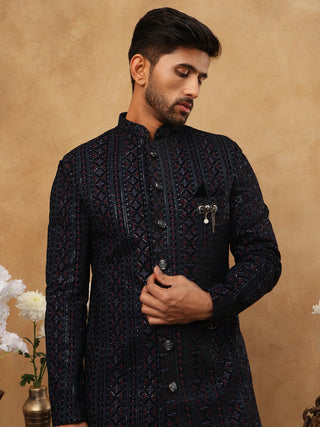 Men's Navy Blue Geometric Embroidered Indo Western Set
