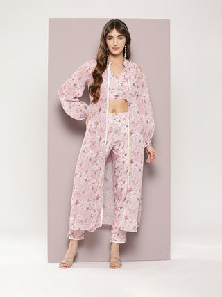 Cream Floral Printed Crop Top with Trousers & Shrug