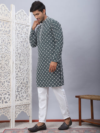 Men's Olive Green Chikankari Embroidered and Sequence Kurtas