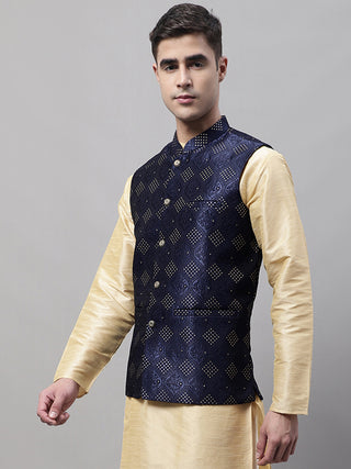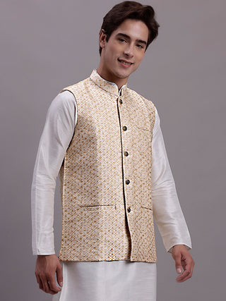 Men's Cream Woven Design Nehru Jacket With Solid Kurta Pyjama.
