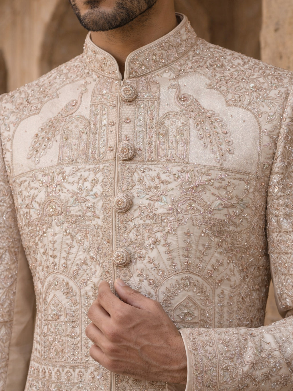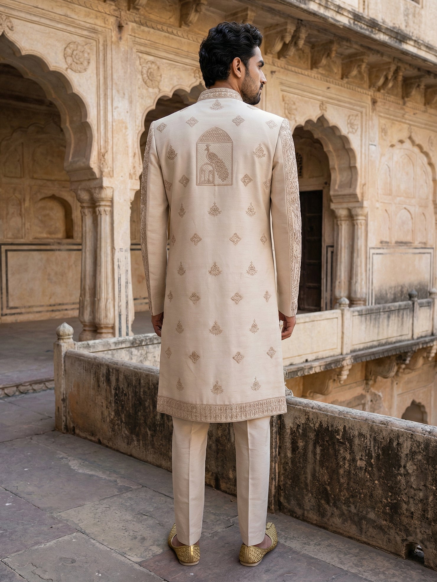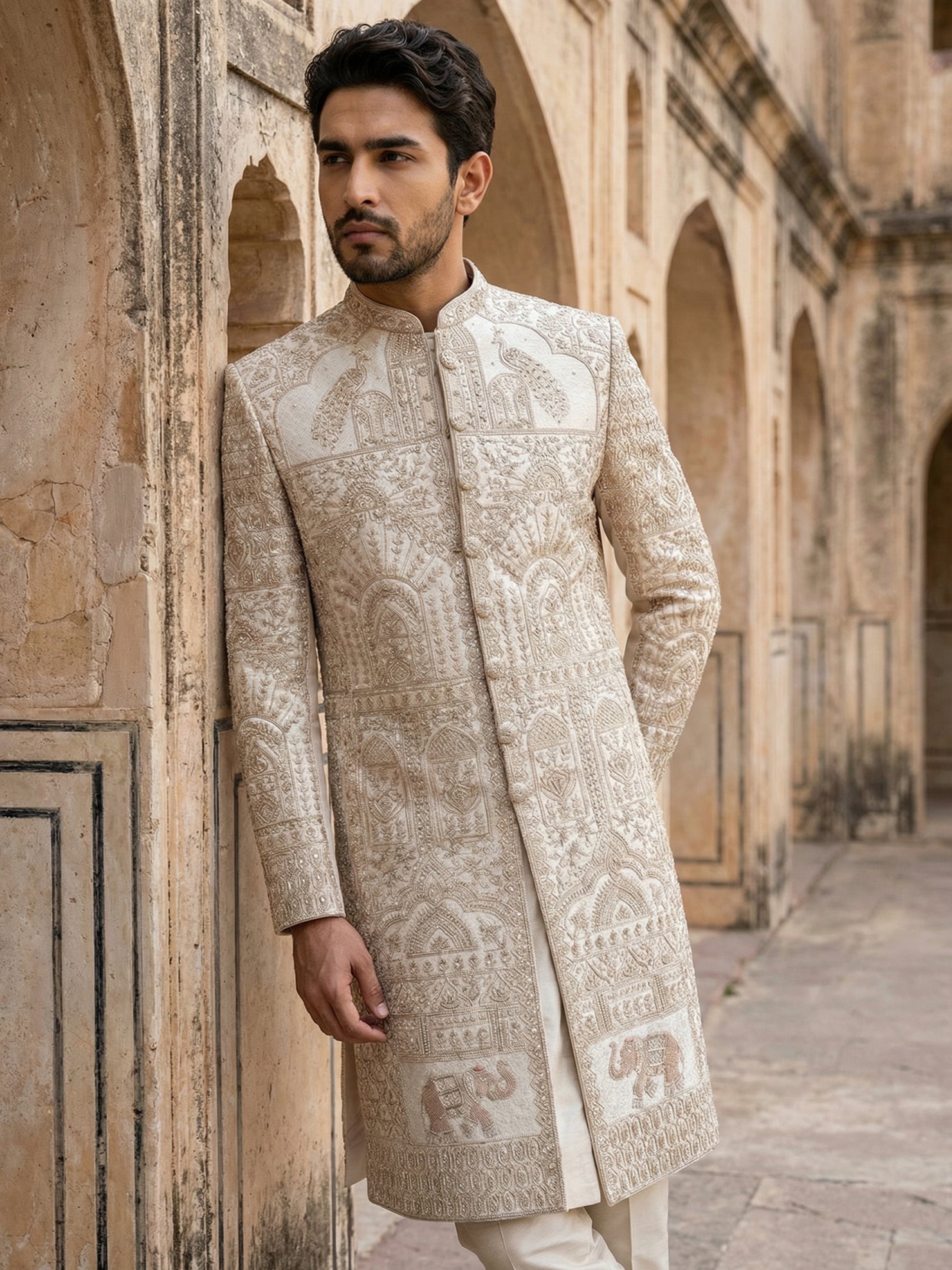 Crafted in a luxurious silk blend fabric, this sherwani features ornate embroidery inspired by heritage motifs. The tailored fit, mandarin collar and elegant detailing create a regal look, paired with a kurta and churidar for a complete ethnic ensemble.