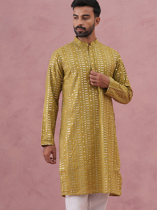 Men Mehndi Green Chikankari Embroidered and Sequence Kurta with Churidar