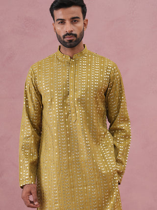 Men's Olive Green Sequins and Embroidred Nehru Jacket With Solid Kurta Pyjama.