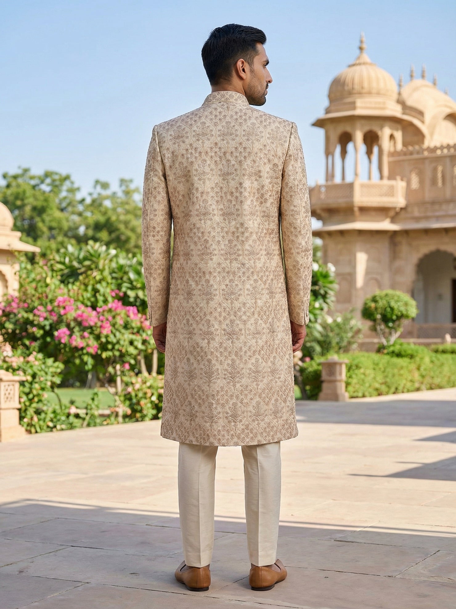Elegant sherwani set crafted in a premium silk blend fabric, featuring intricate all-over embroidery and a mandarin collar. Finished with a buttoned front and paired with a coordinated churidar, delivering a regal look for weddings and festive occasions.