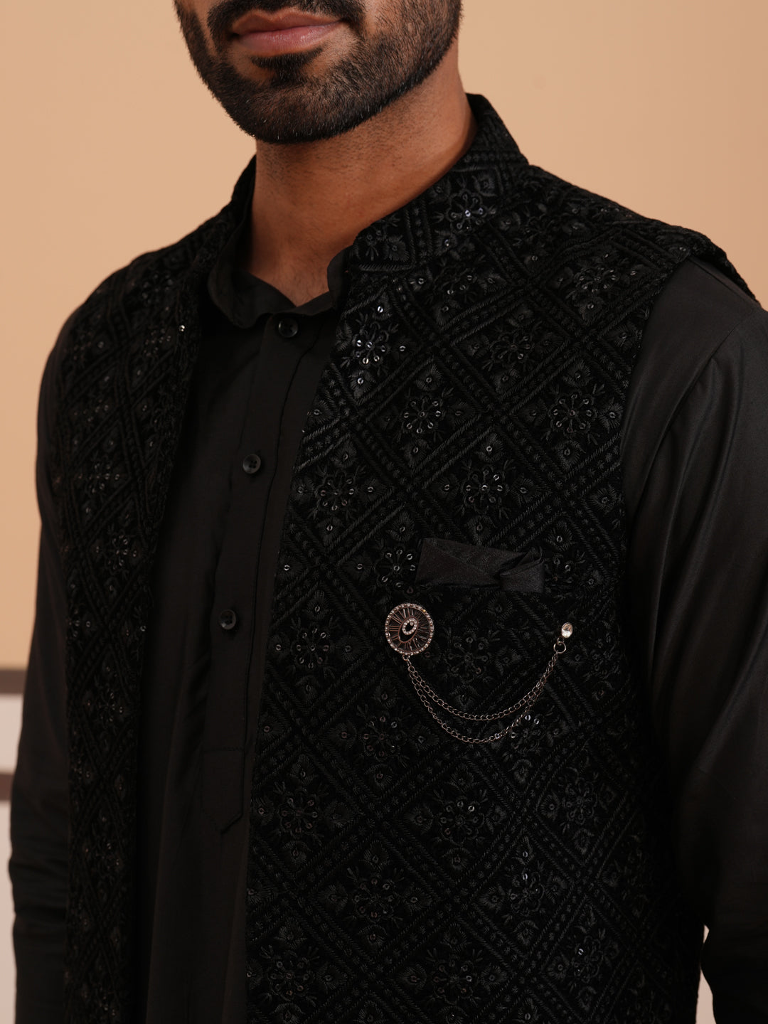 Black Embroidered Long Shrug with Kurta Pyjama Set