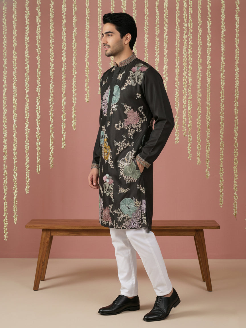 Black Silk Blend Embroidered Kurta Pyjama