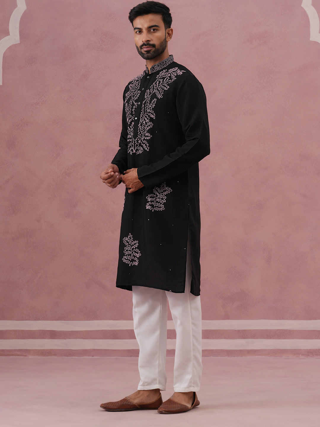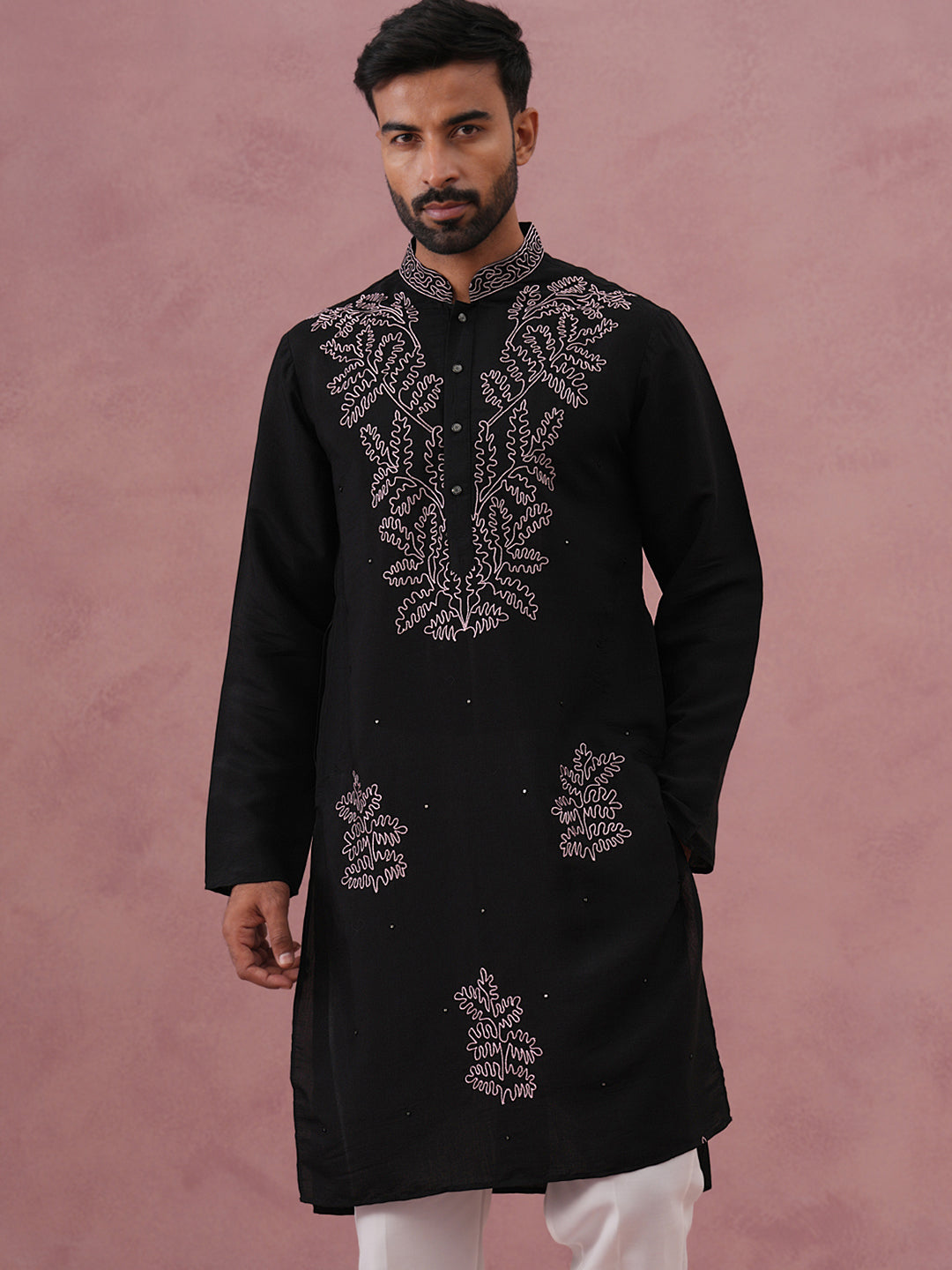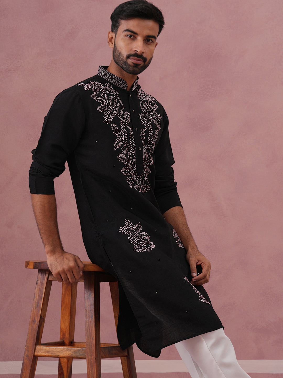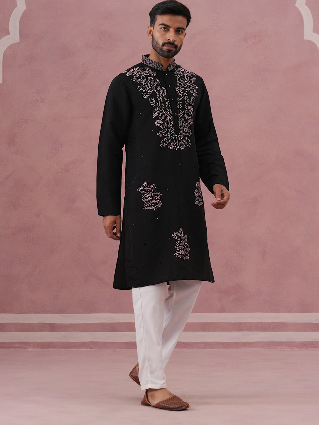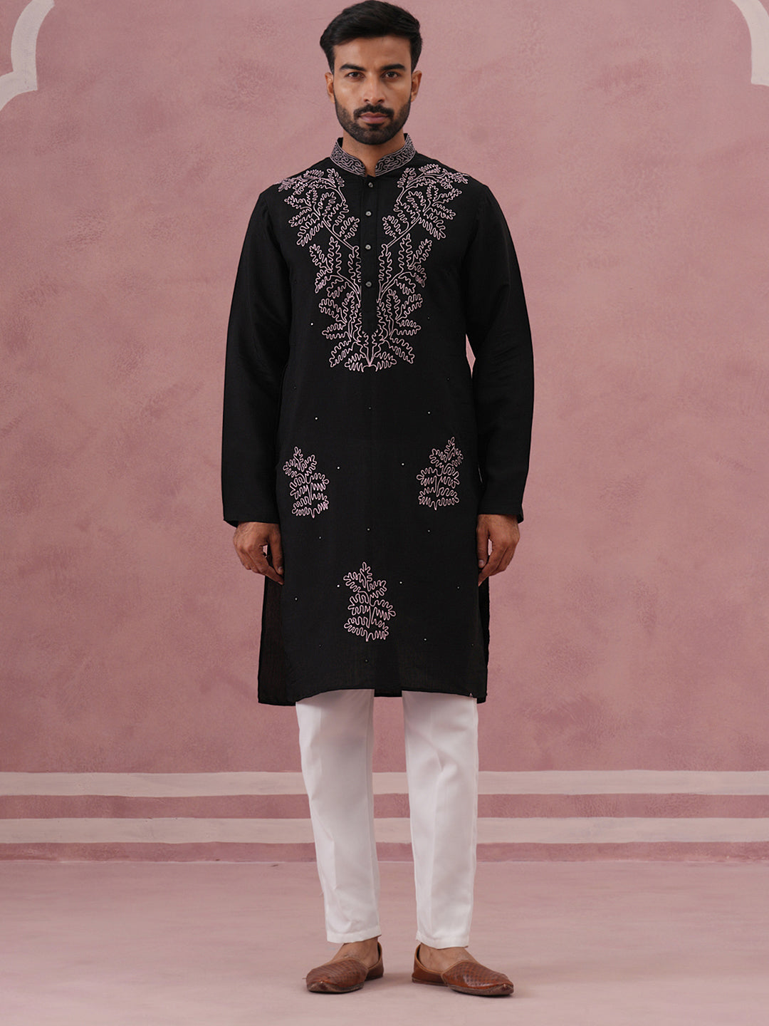 Black Silk Blend Embroidered Kurta Pyjama Set