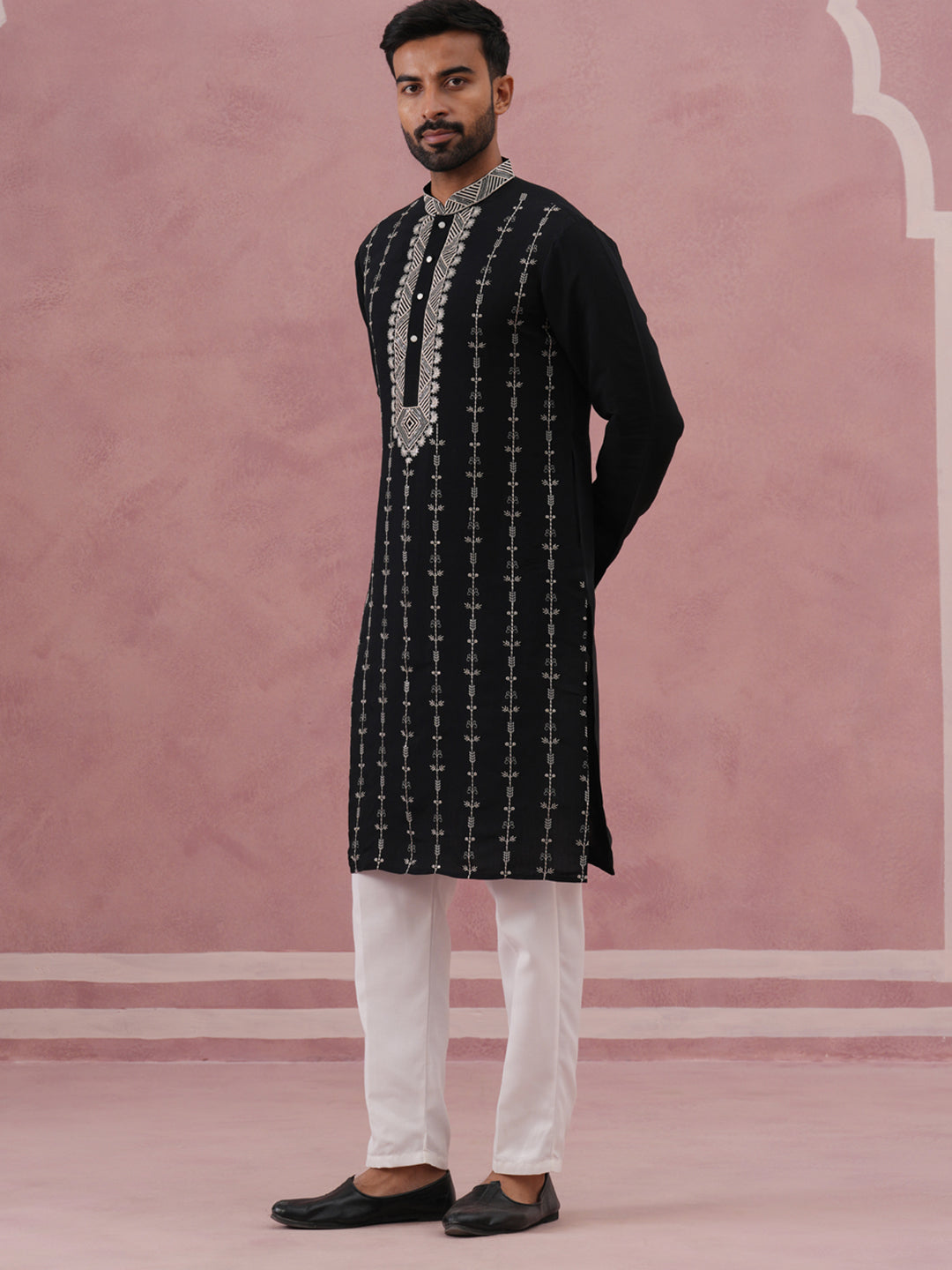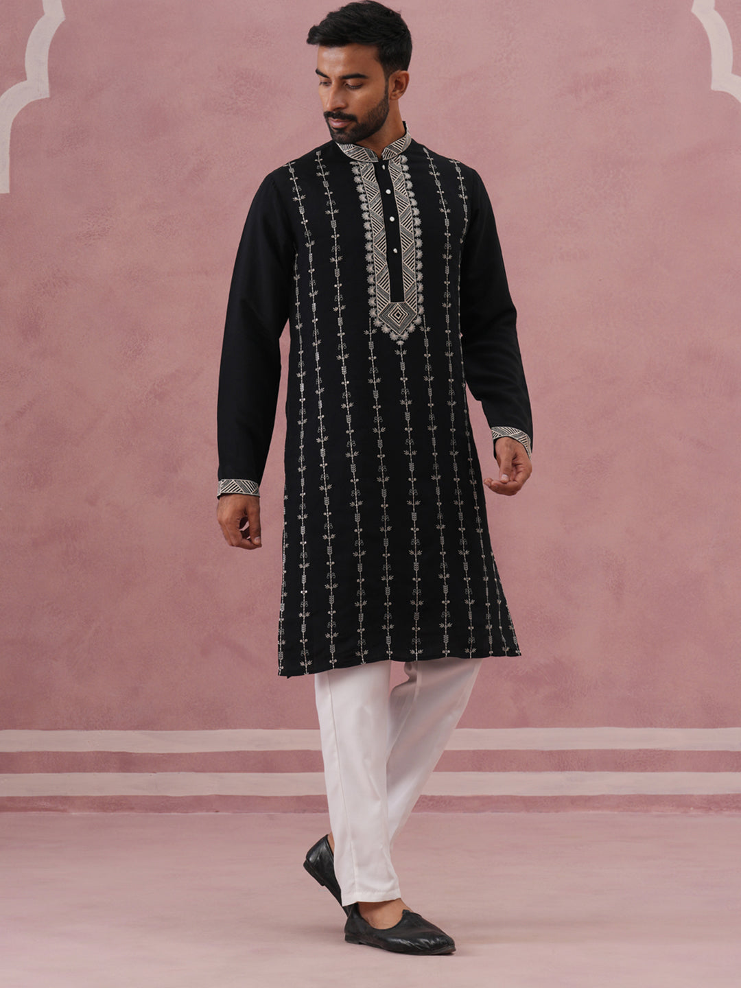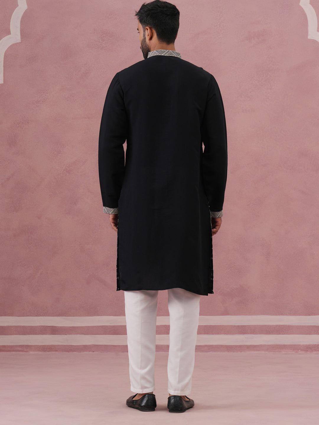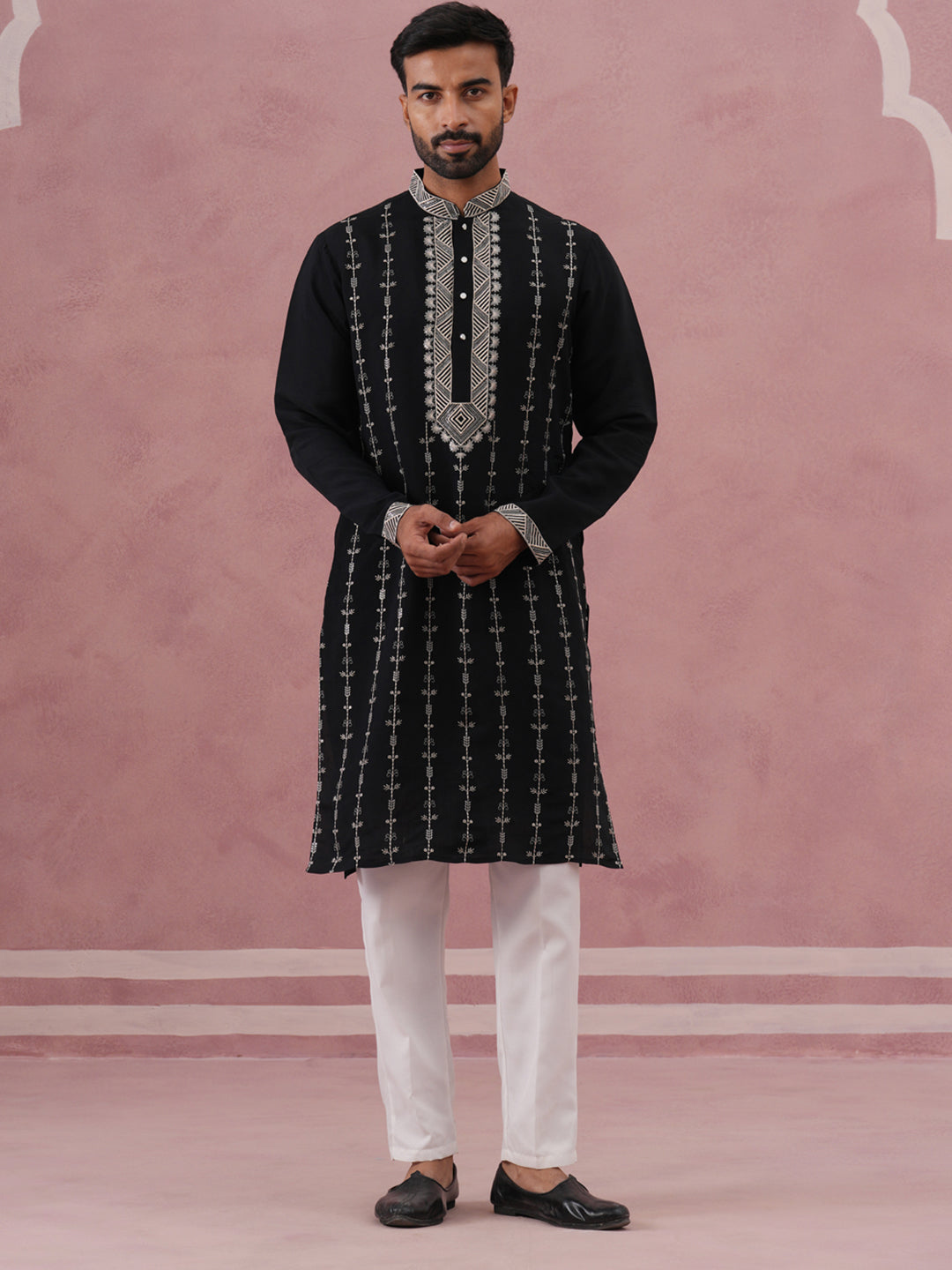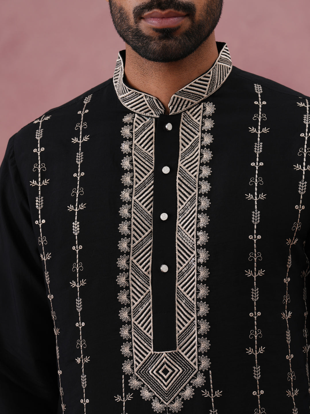 Black Silk Blend Kurta Set with Off White Geometric Embroidery