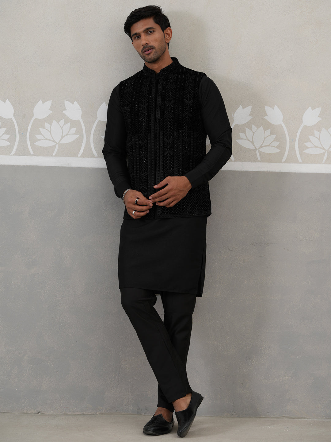 Black Velvet Nehru Jacket with Kurta Pyjama Set