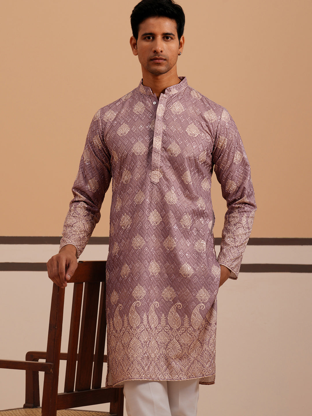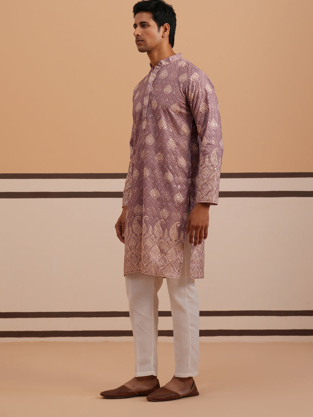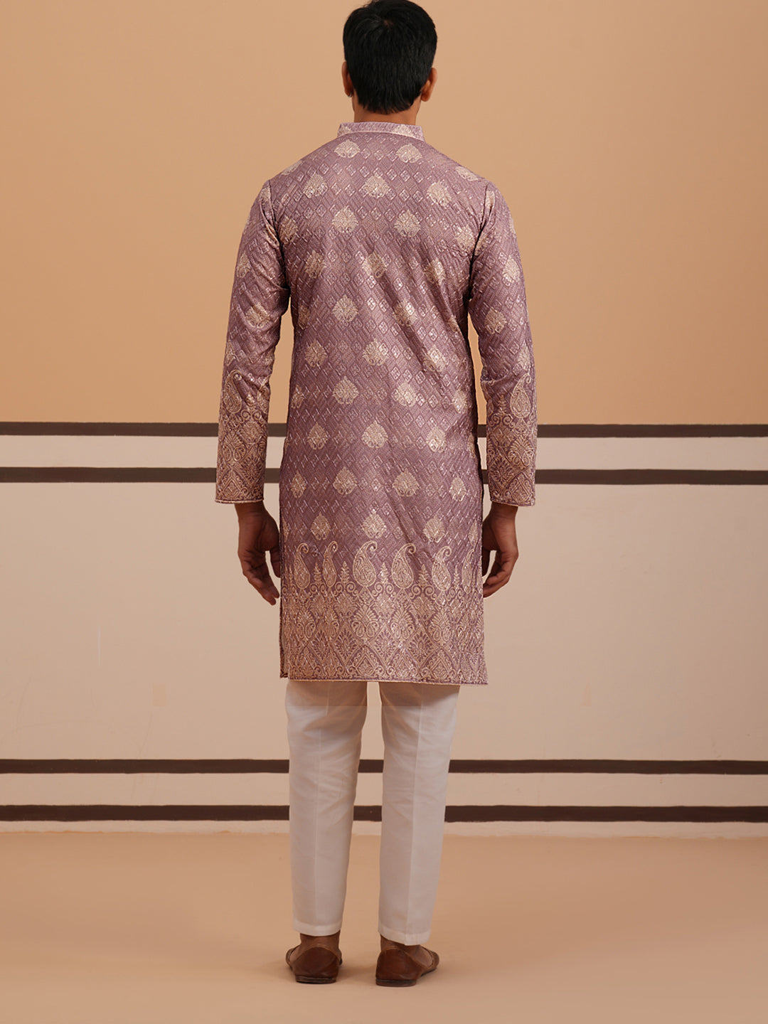 Embroidered Cotton-Blend Kurta Pyjama with Paisley Design