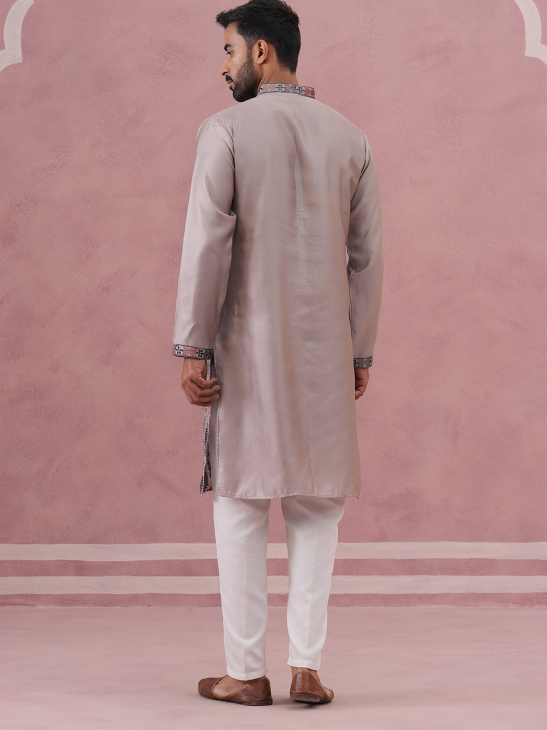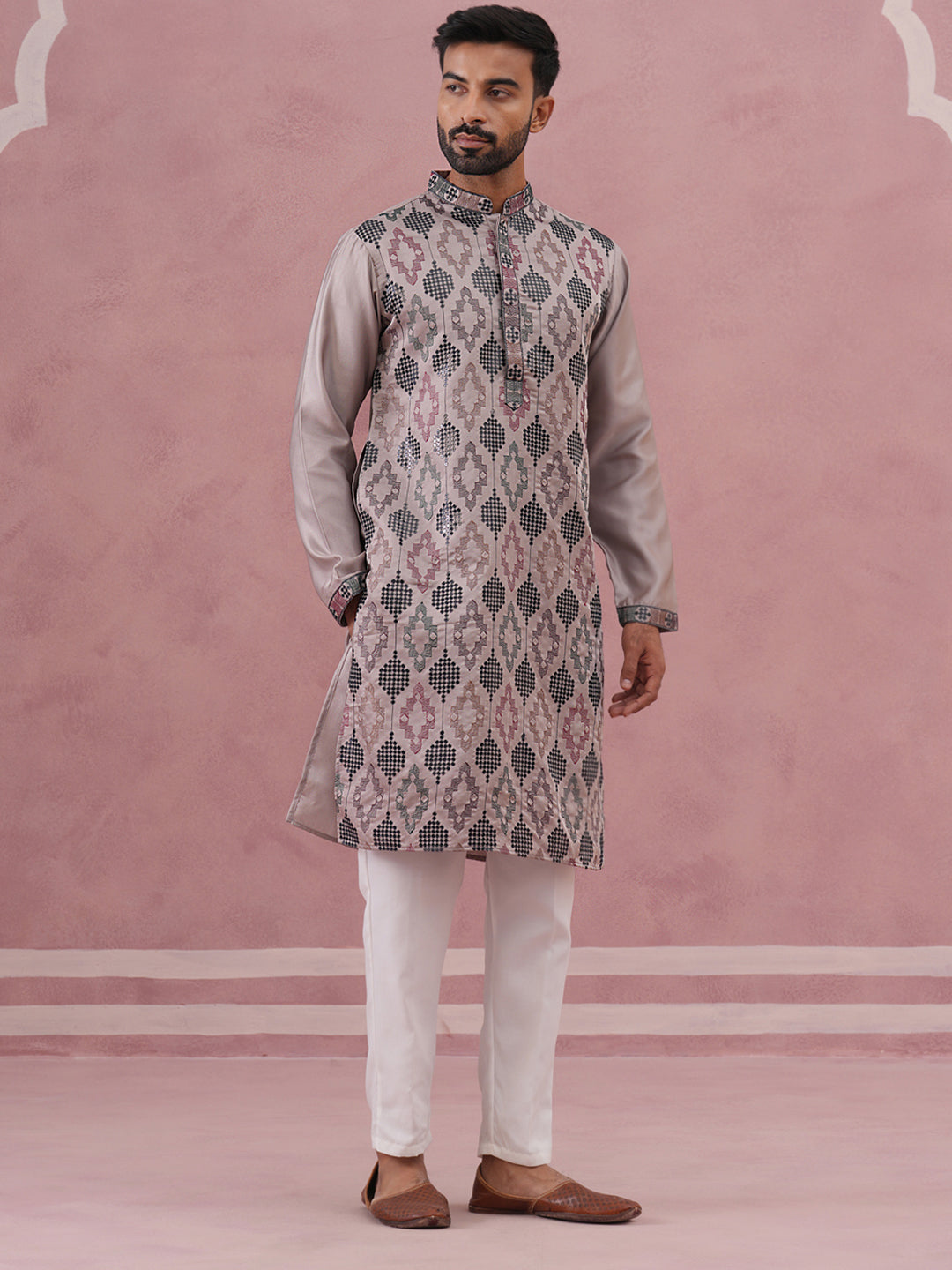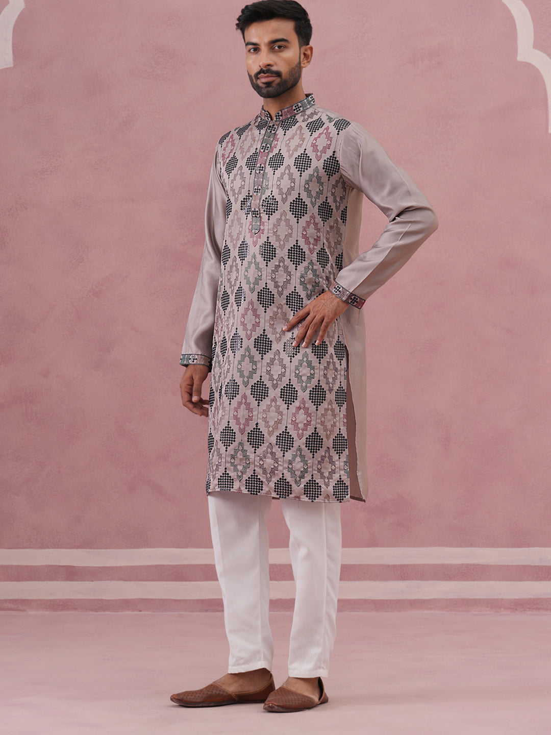 Grey Silk Blend Geometric Embroidered Kurta Set