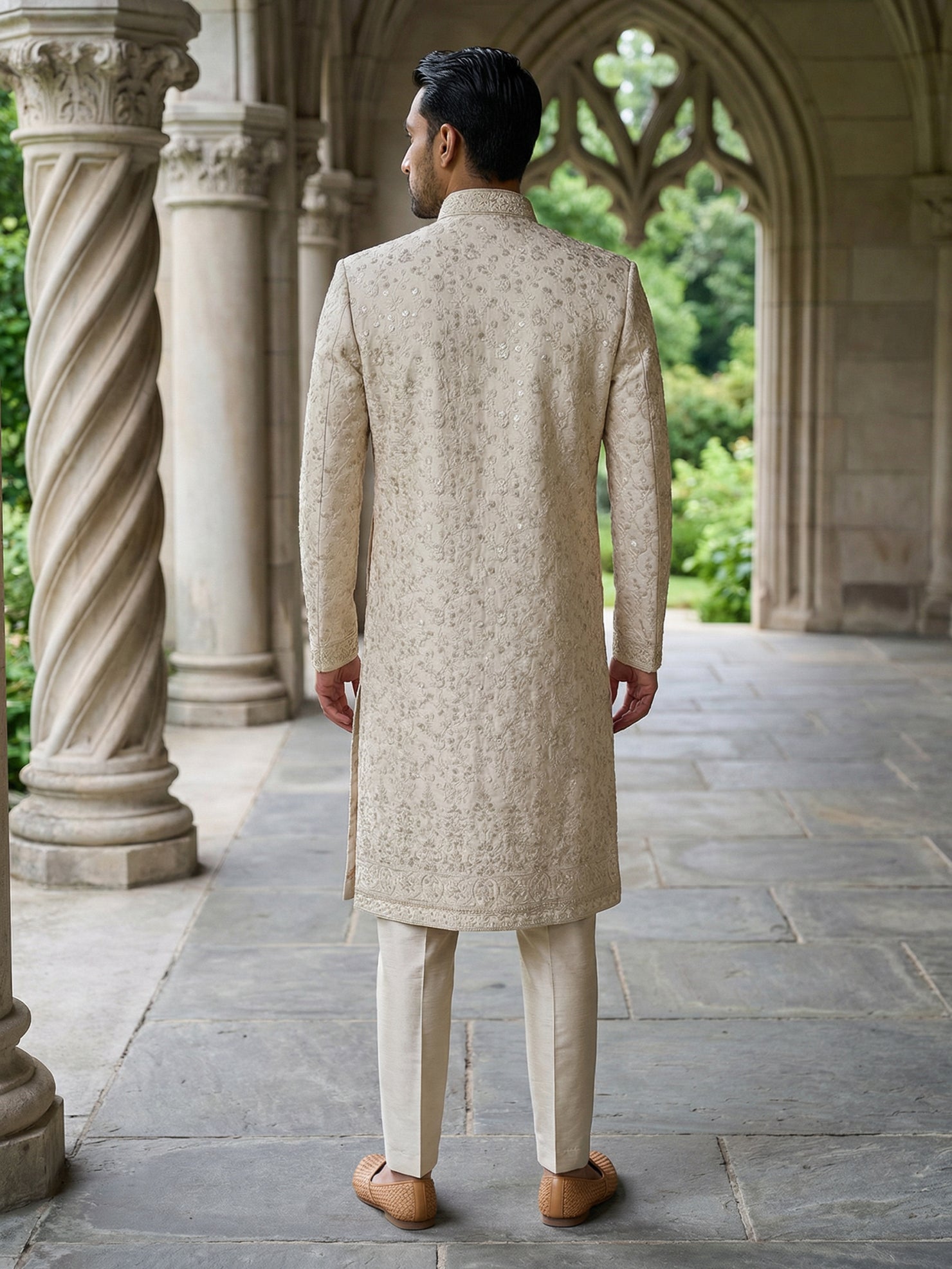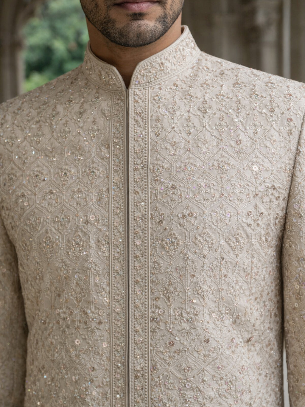 A luxurious ivory-gold silk blend sherwani set featuring intricate all-over embroidery and a refined regal silhouette. Designed for grooms who seek timeless elegance with a royal finish.
