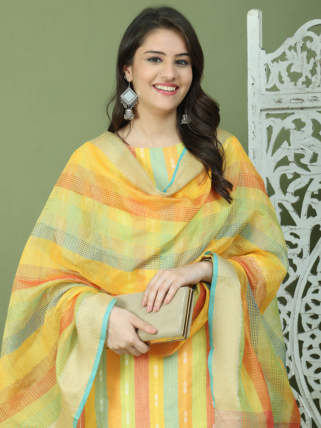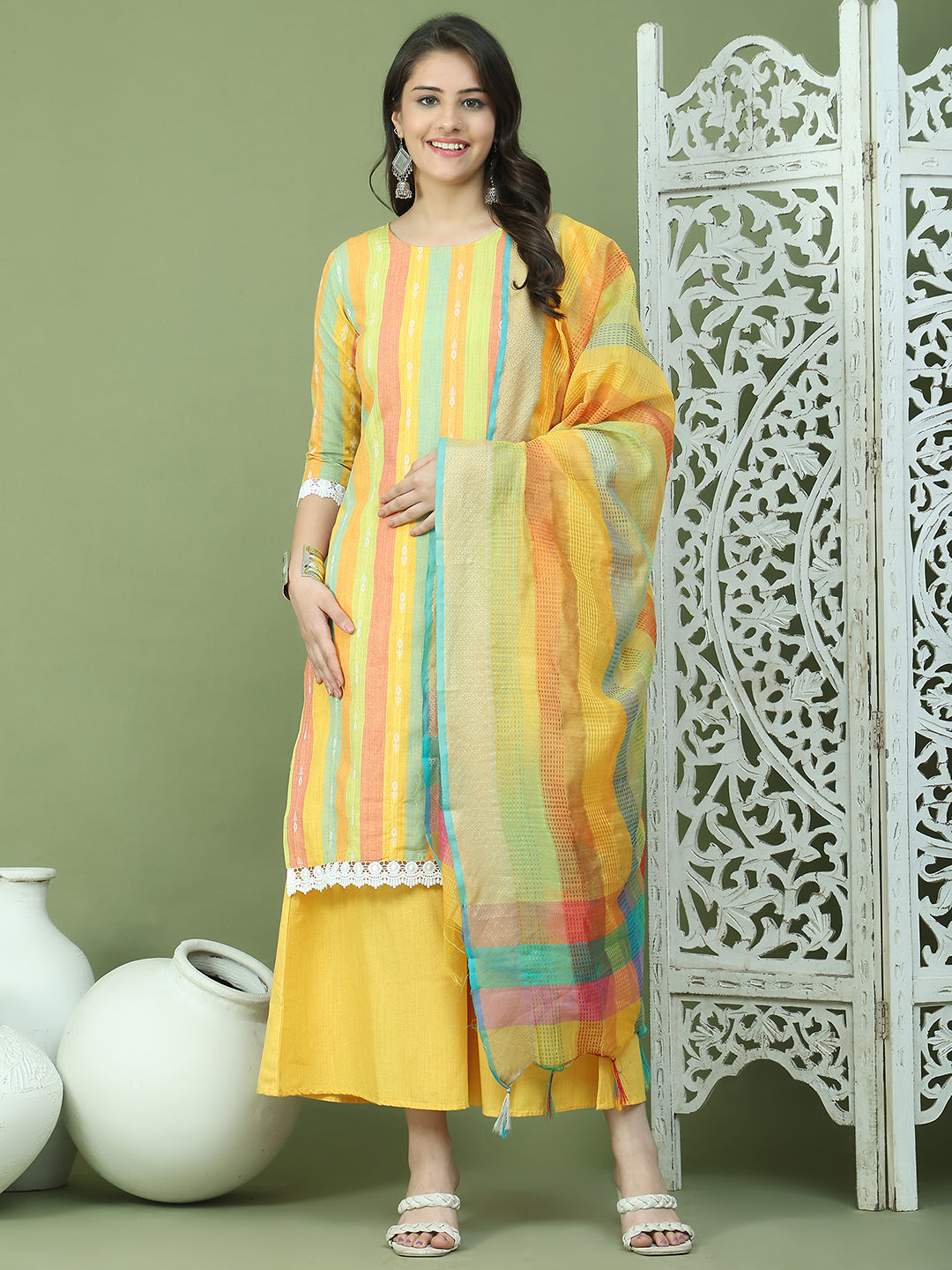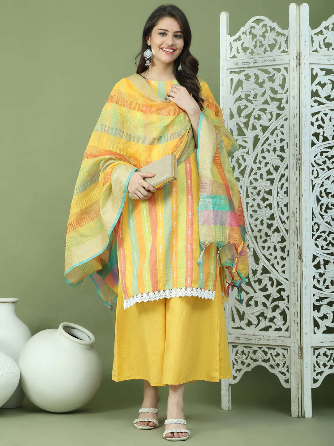 Lace Work, Woven Design straight Kurta Palazzo Dupatta Set