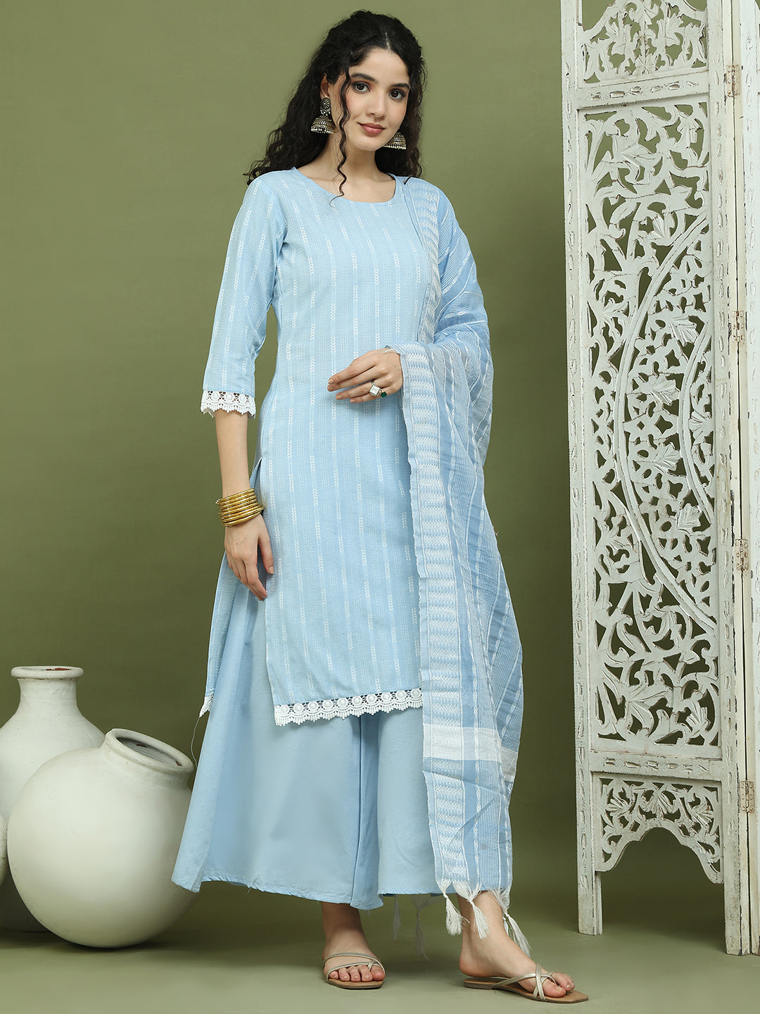 Lace Work, Woven Design straight Kurta Palazzo With Dupatta