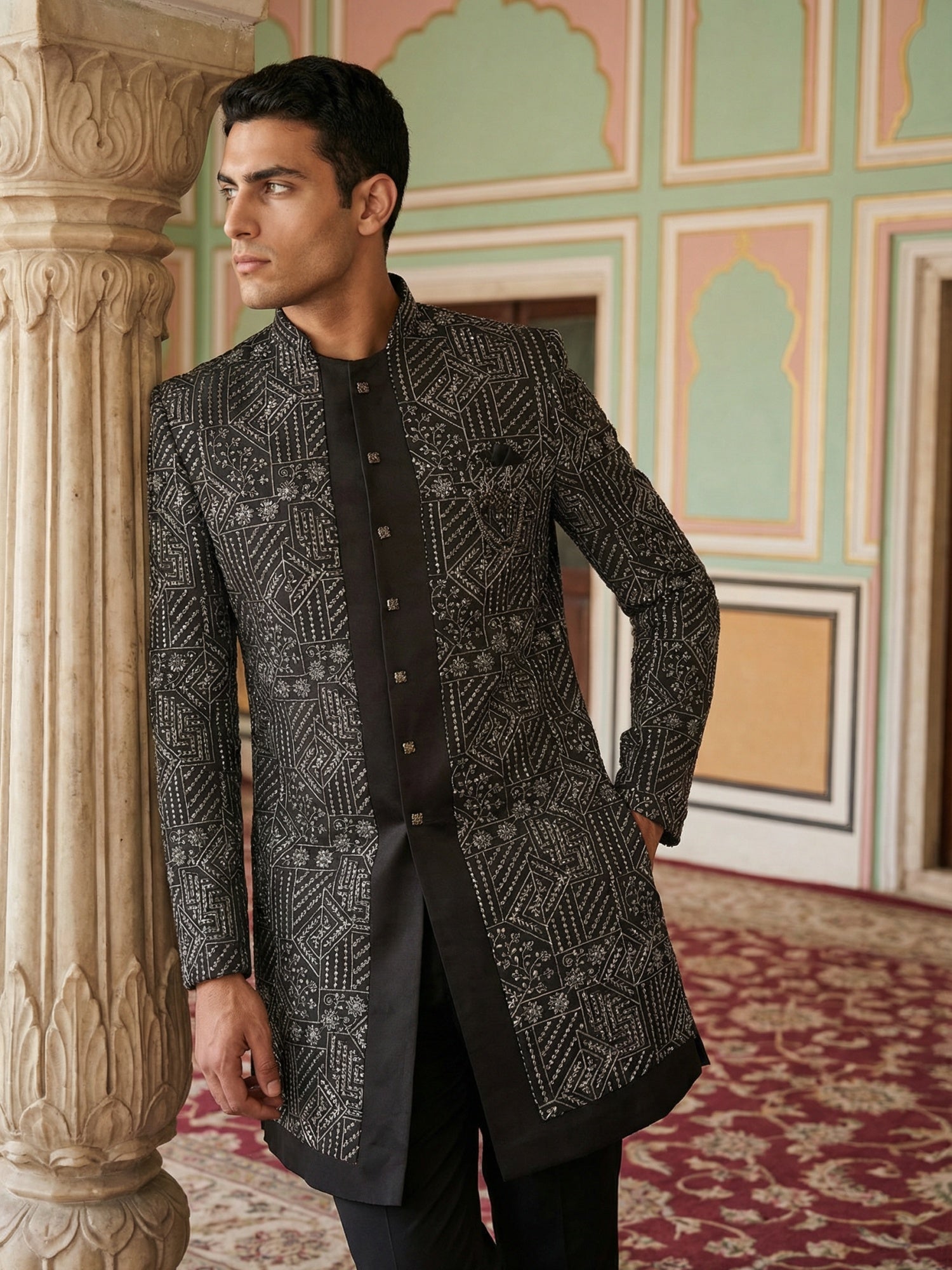 this Men’s Black Embroidered Indo-Western Set, thoughtfully designed for wedding functions and special celebrations. The detailed embroidery adds a royal touch, while the modern Indo-Western cut ensures comfort and effortless style. Complete with a coordinated Jacket and trousers, this ensemble is perfect for receptions, sangeet nights, and festive gatherings.