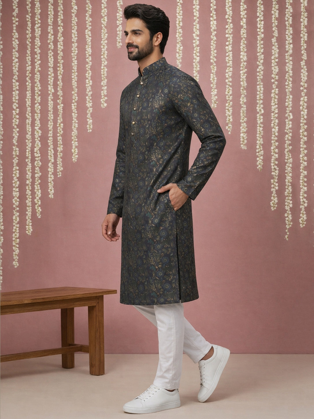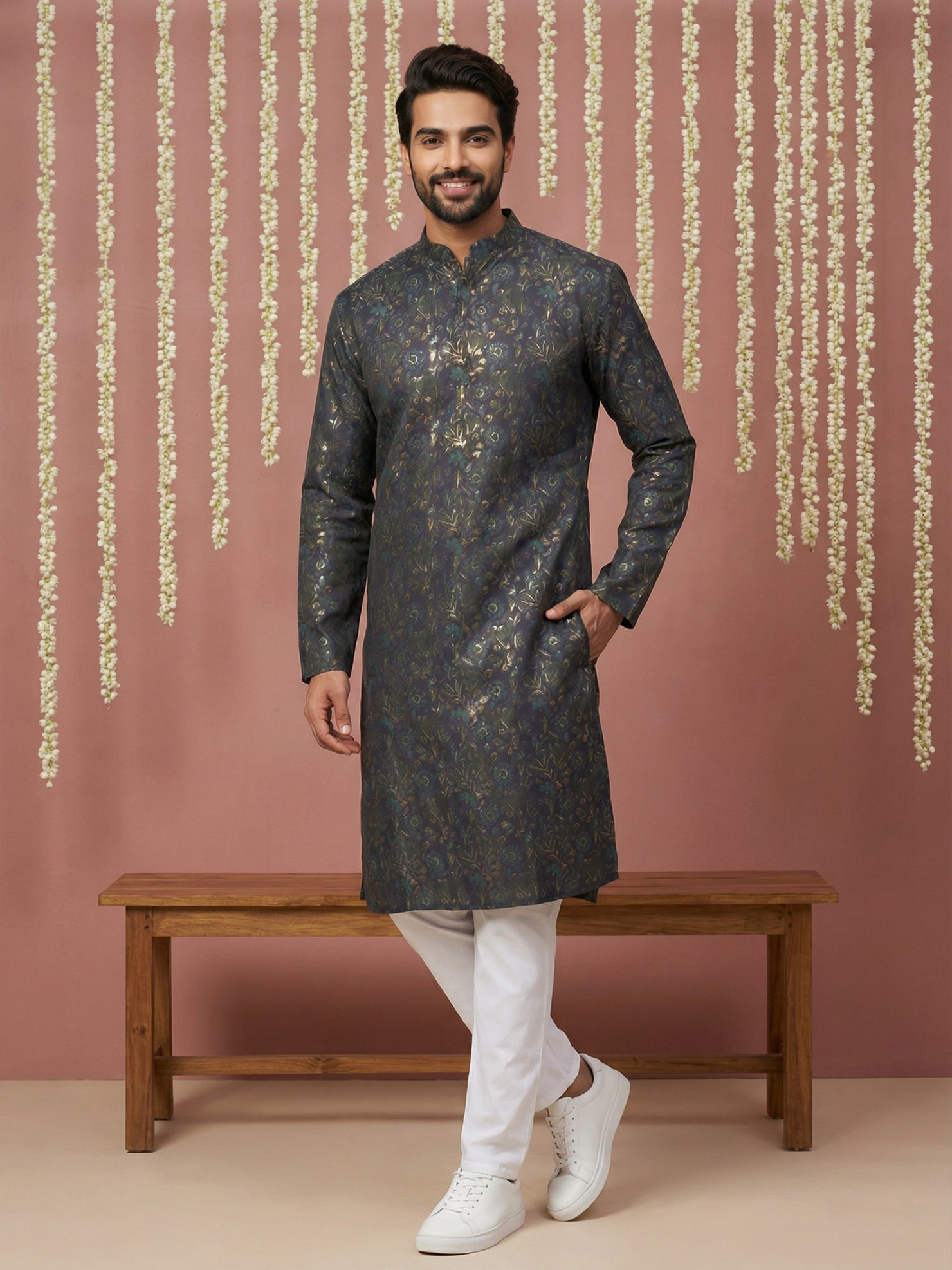 Men Cotton Blend Kurta Pyjama with Foil Print