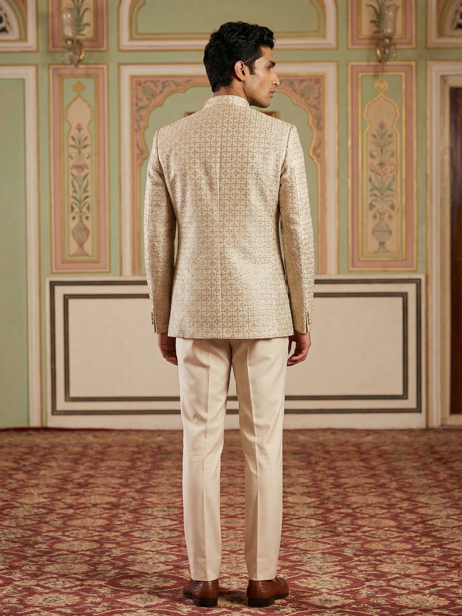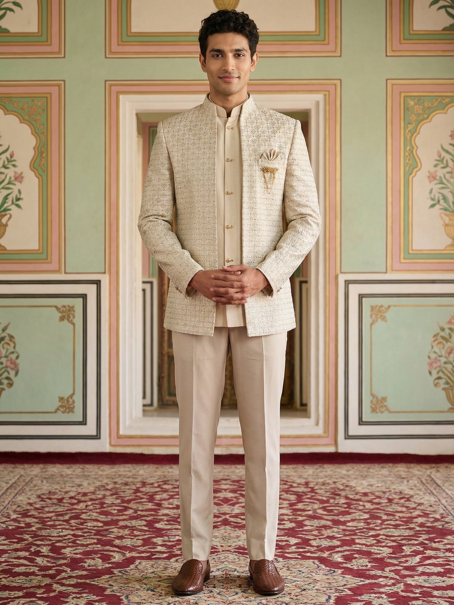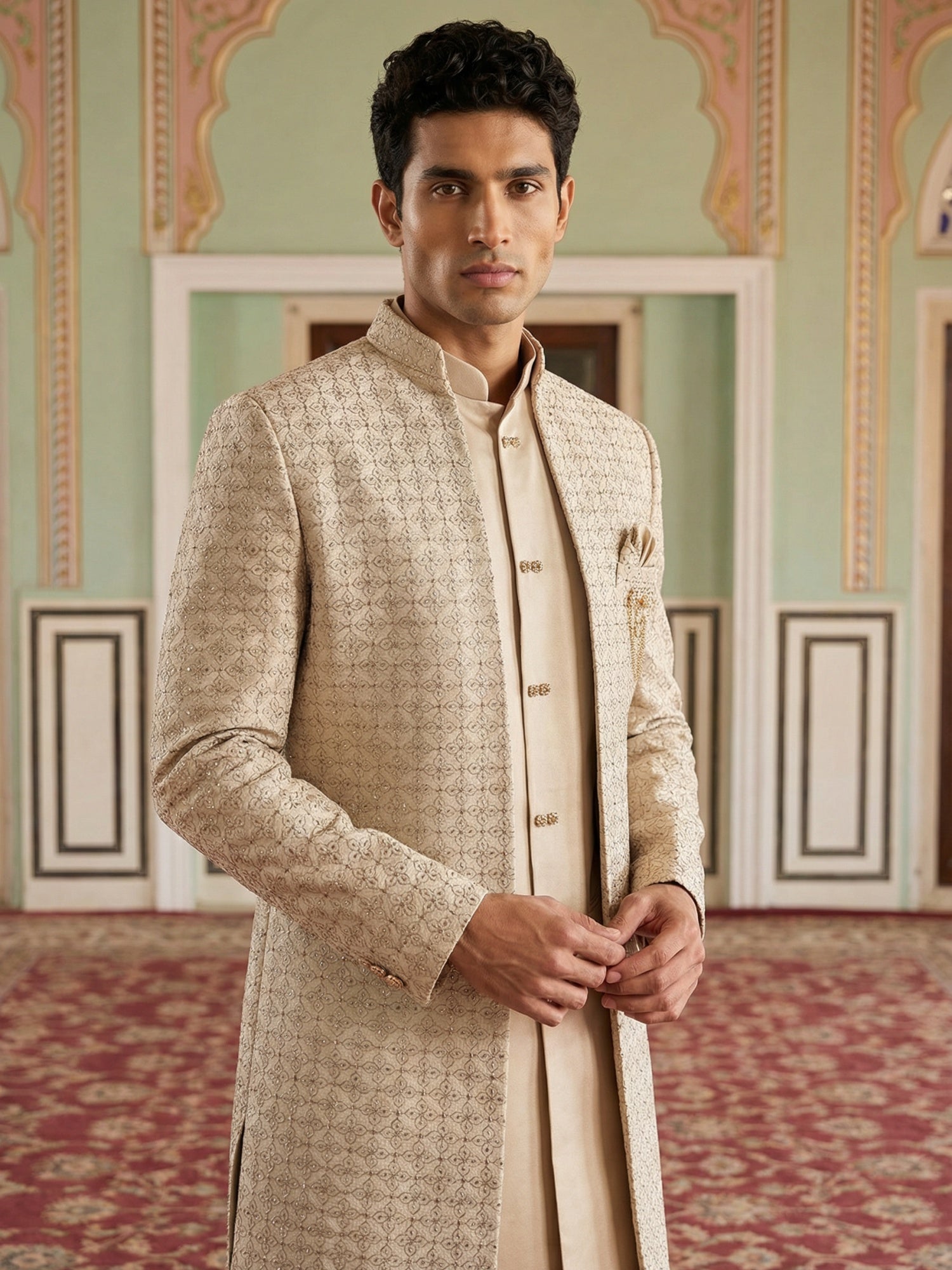 this premium Indo-Western set featuring an intricately embroidered open jacket paired with a solid waistcoat and tailored trousers. The soft pastel tone and modern silhouette make it perfect for weddings, receptions, and special occasions.