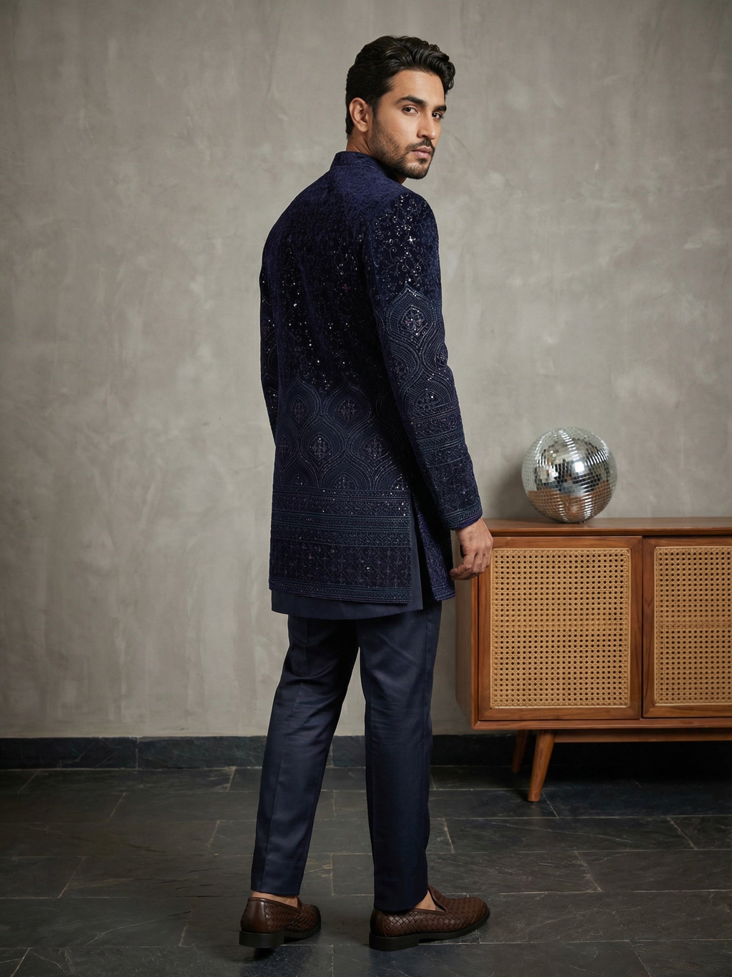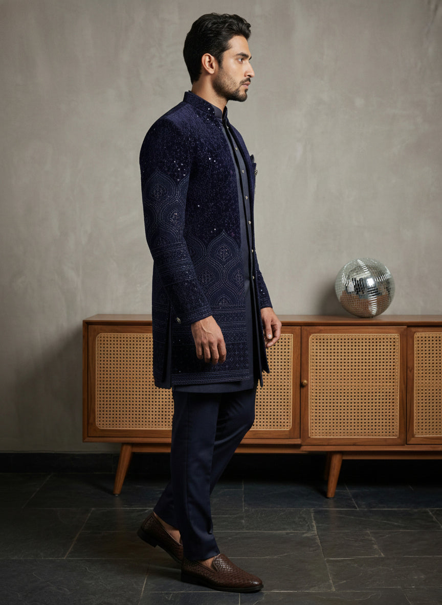 This Men’s Navy Blue Embroidered Indo-Western Set blends classic craftsmanship with contemporary tailoring. The embroidered jacket, paired with a clean inner panel and tailored trousers, offers a refined and modern ethnic look. Ideal for formal occasions and celebratory events, this outfit ensures effortless style with a premium finish.