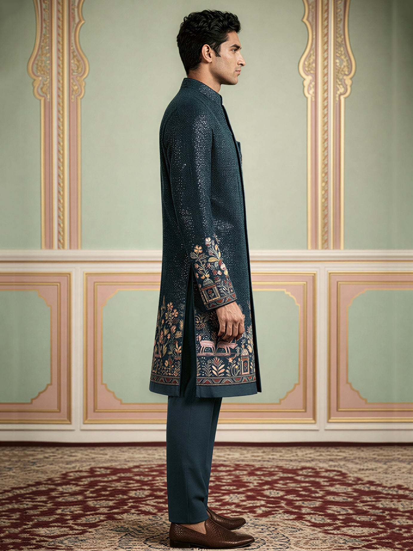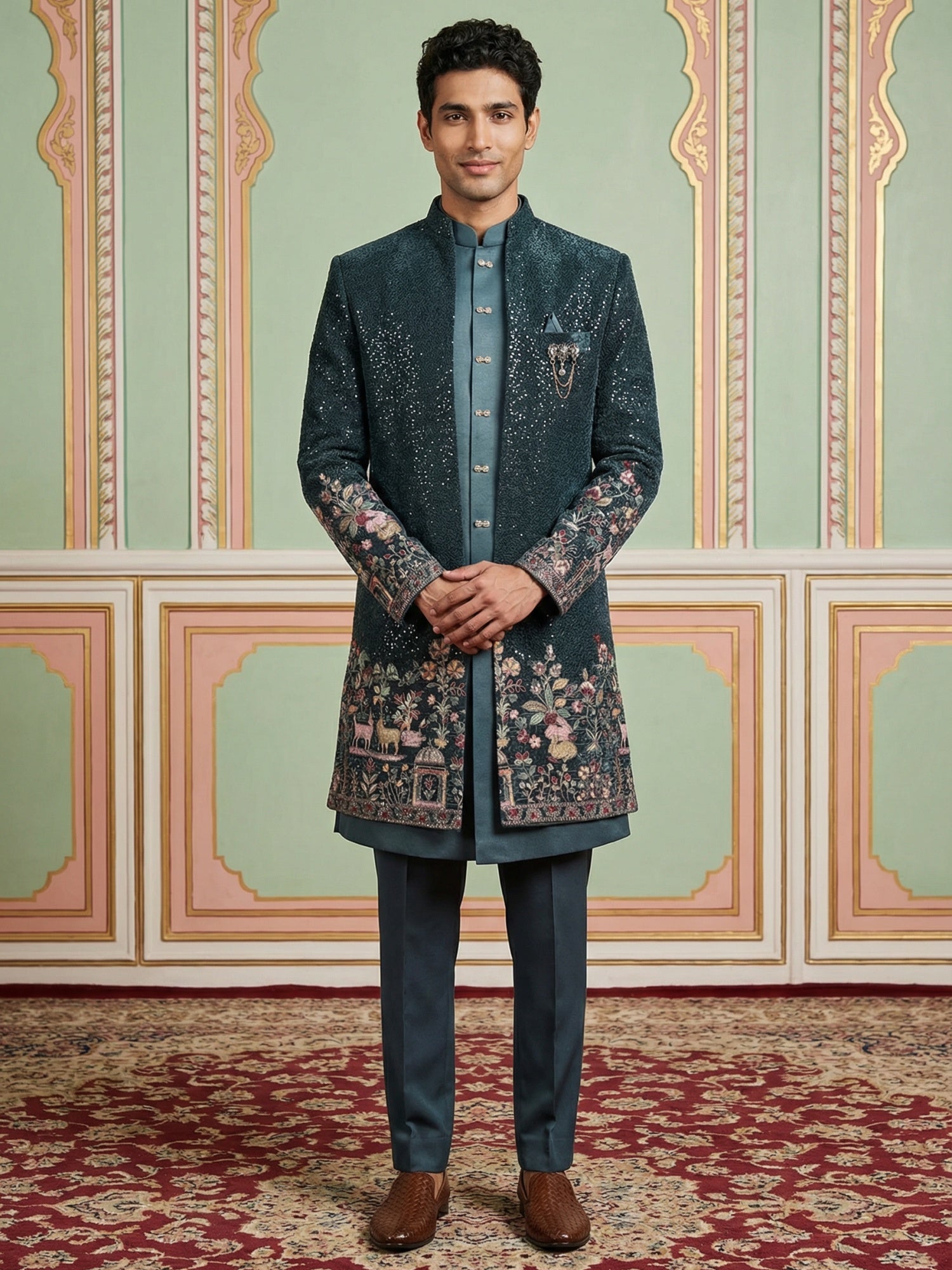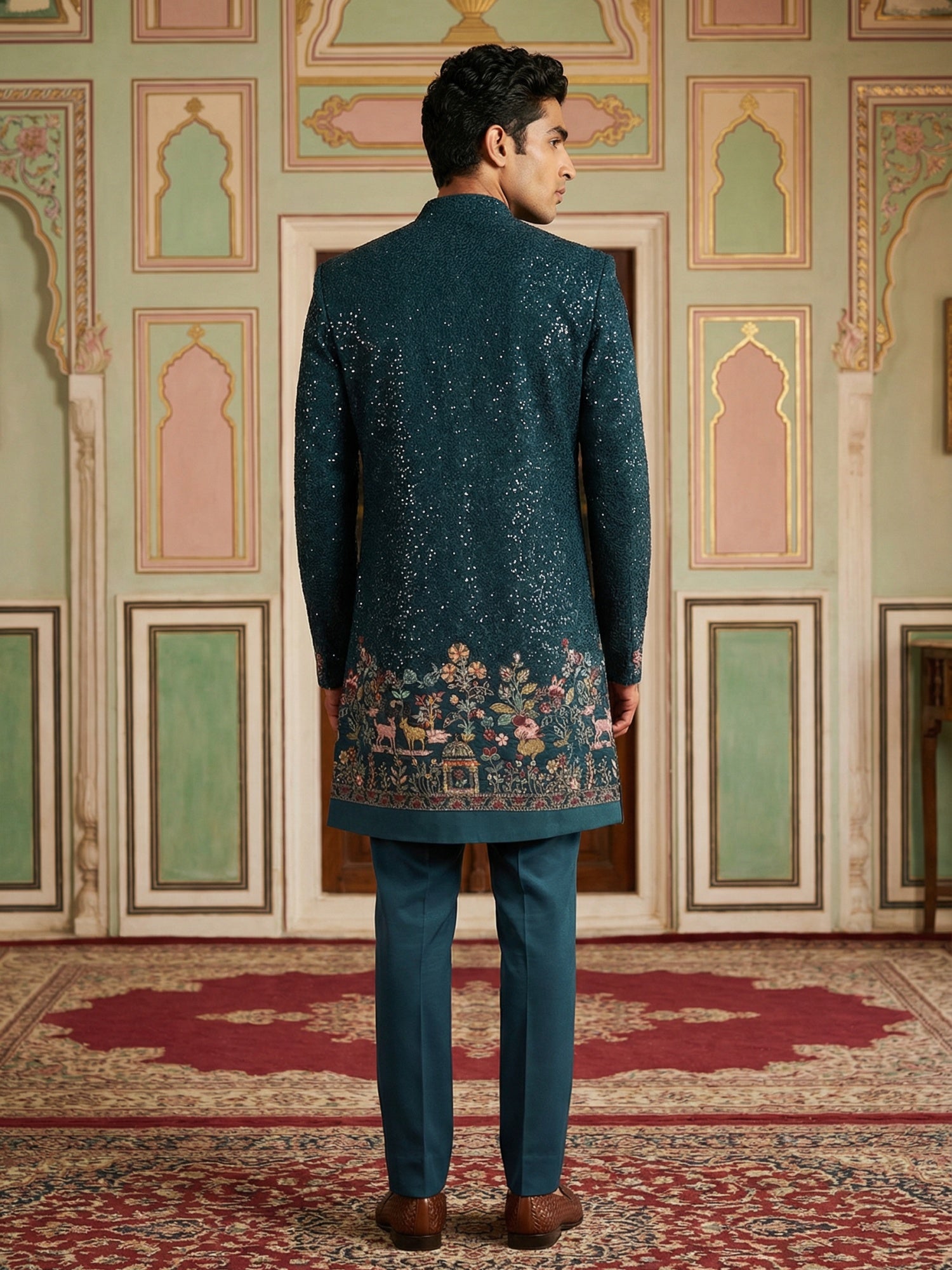 this Men’s Peacock Blue Embroidered Indo-Western Set, crafted for those who appreciate fine detailing and regal style. Designed on a rich Peacock Blue base, the ensemble features exquisite embroidery enhanced with subtle shimmer, creating a luxurious and sophisticated appeal.
