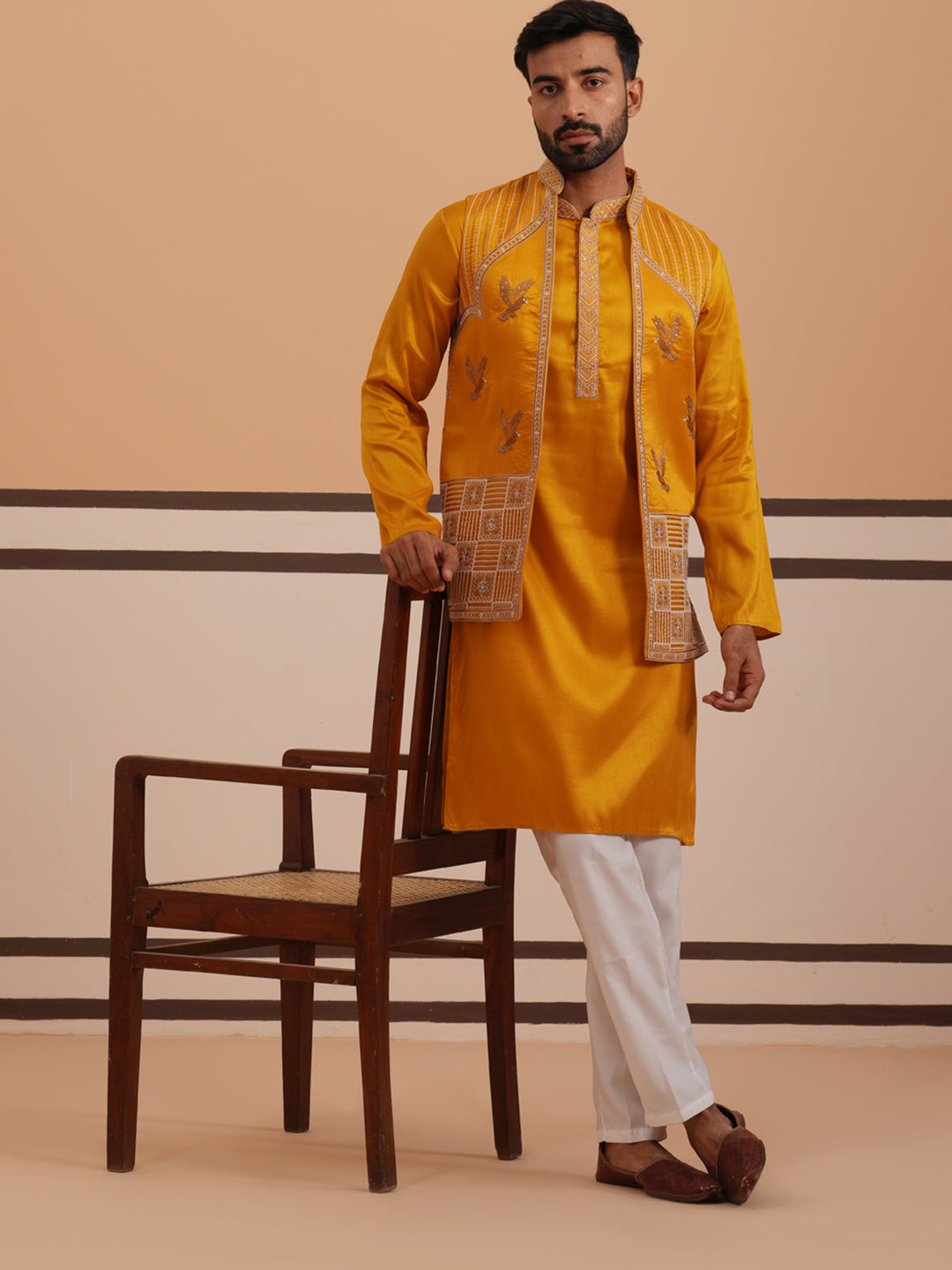 Mustard Embroidered Nehru Jacket & Kurta Pyjama Set