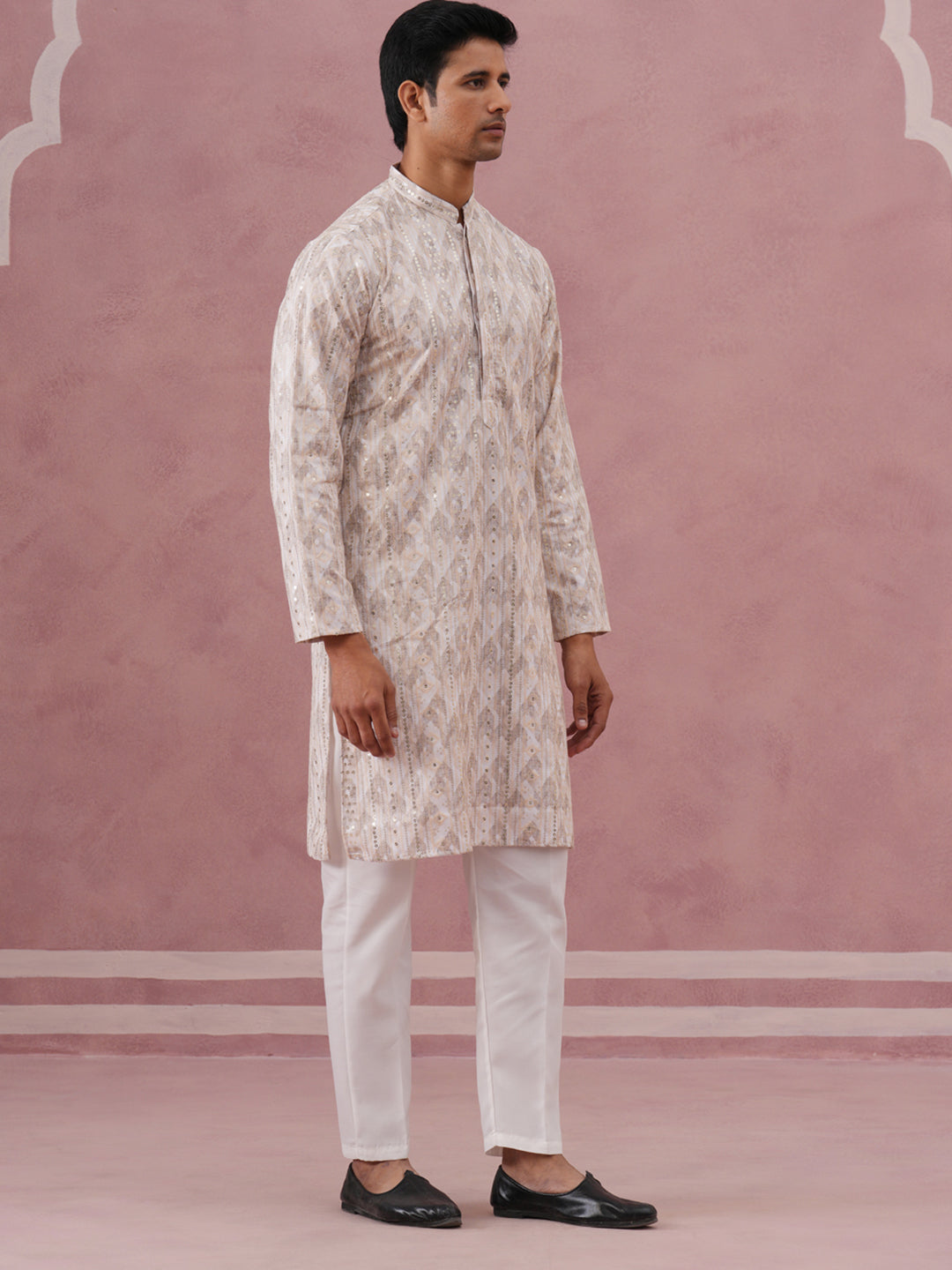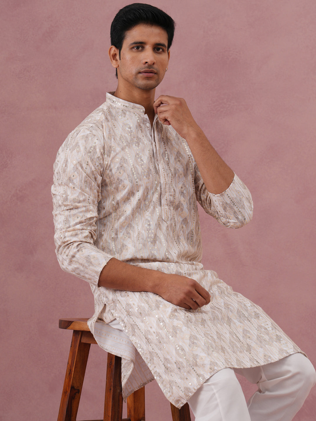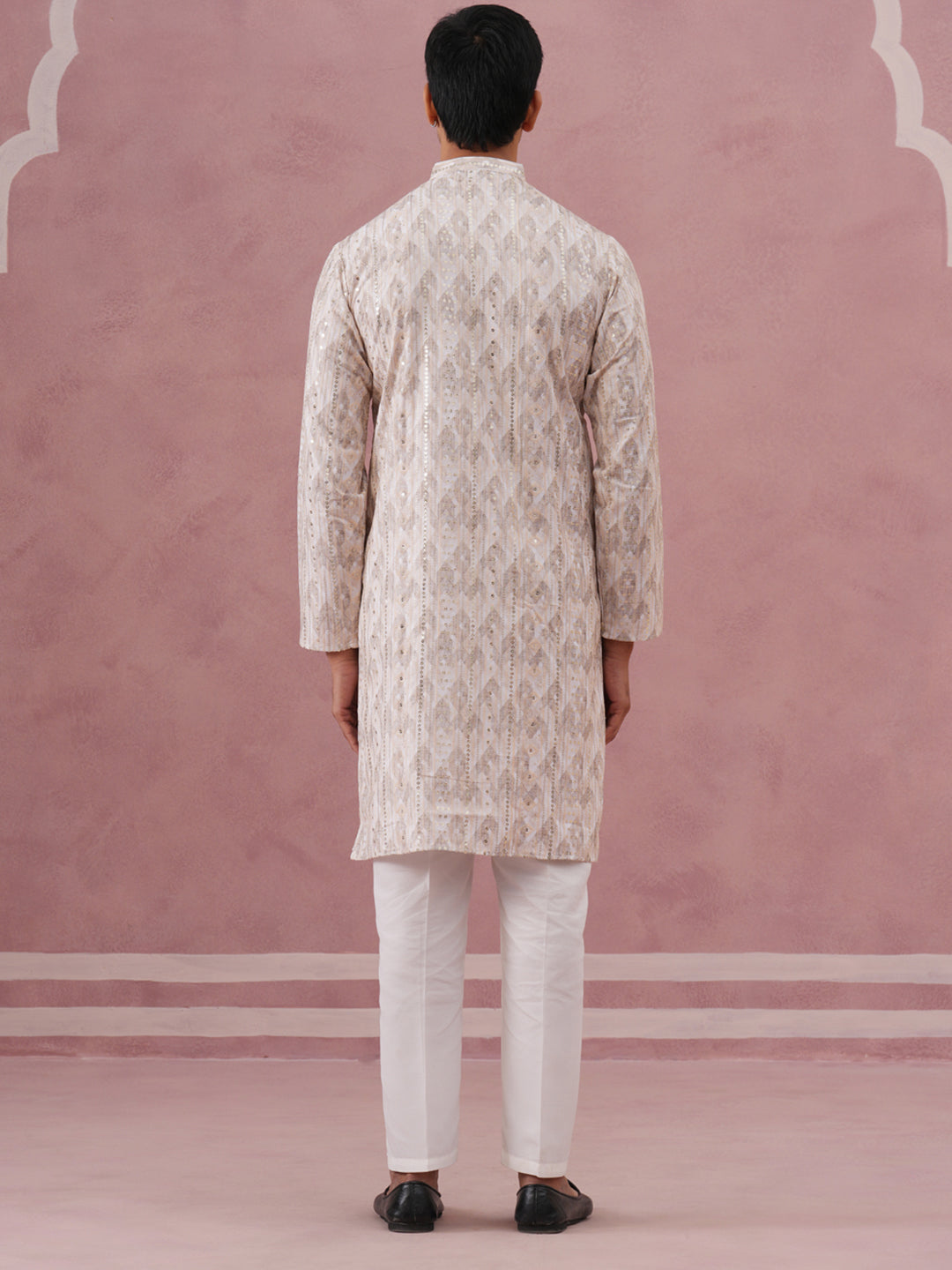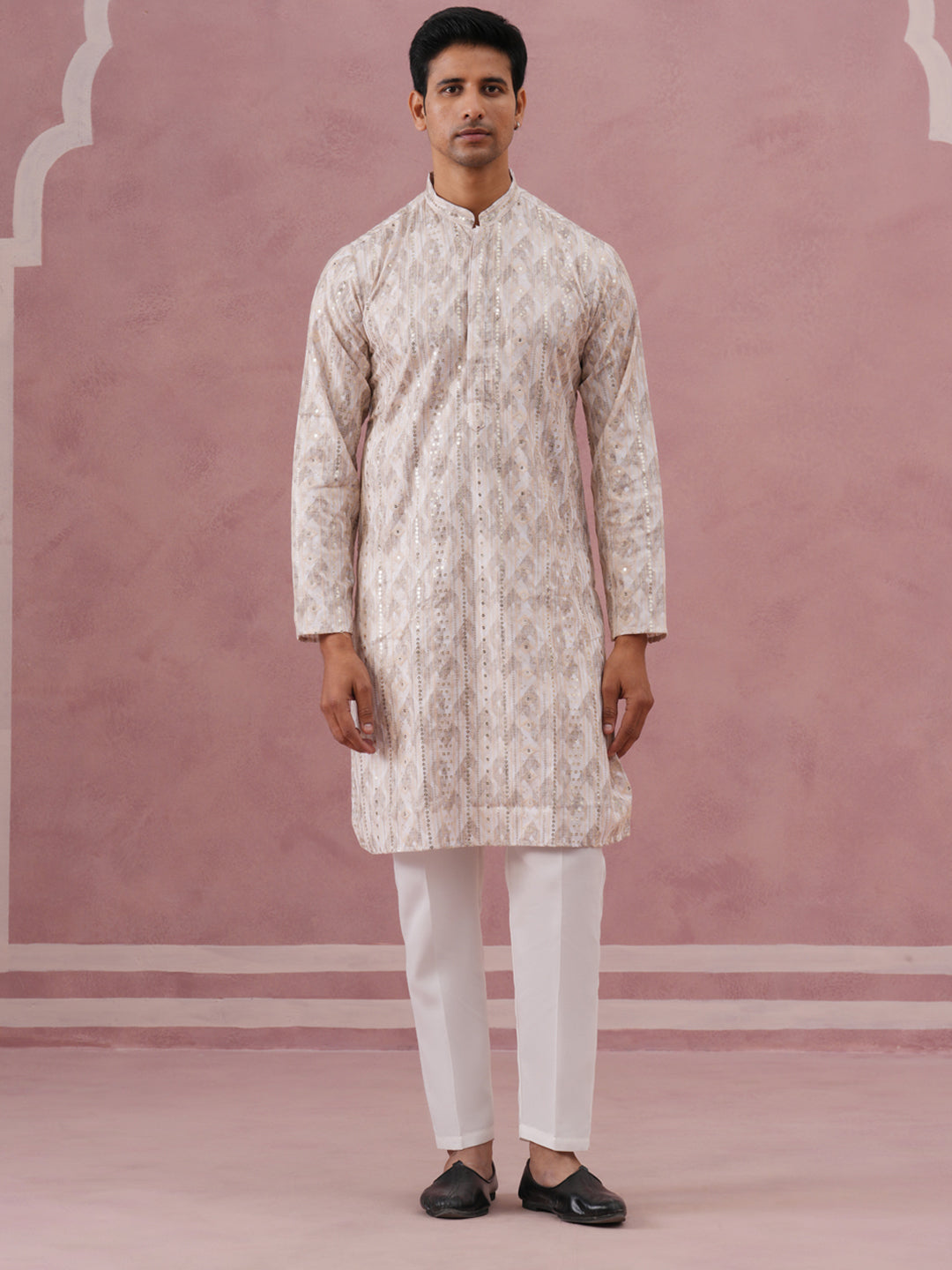 Peach Geometric Print & Sequin Kurta Set