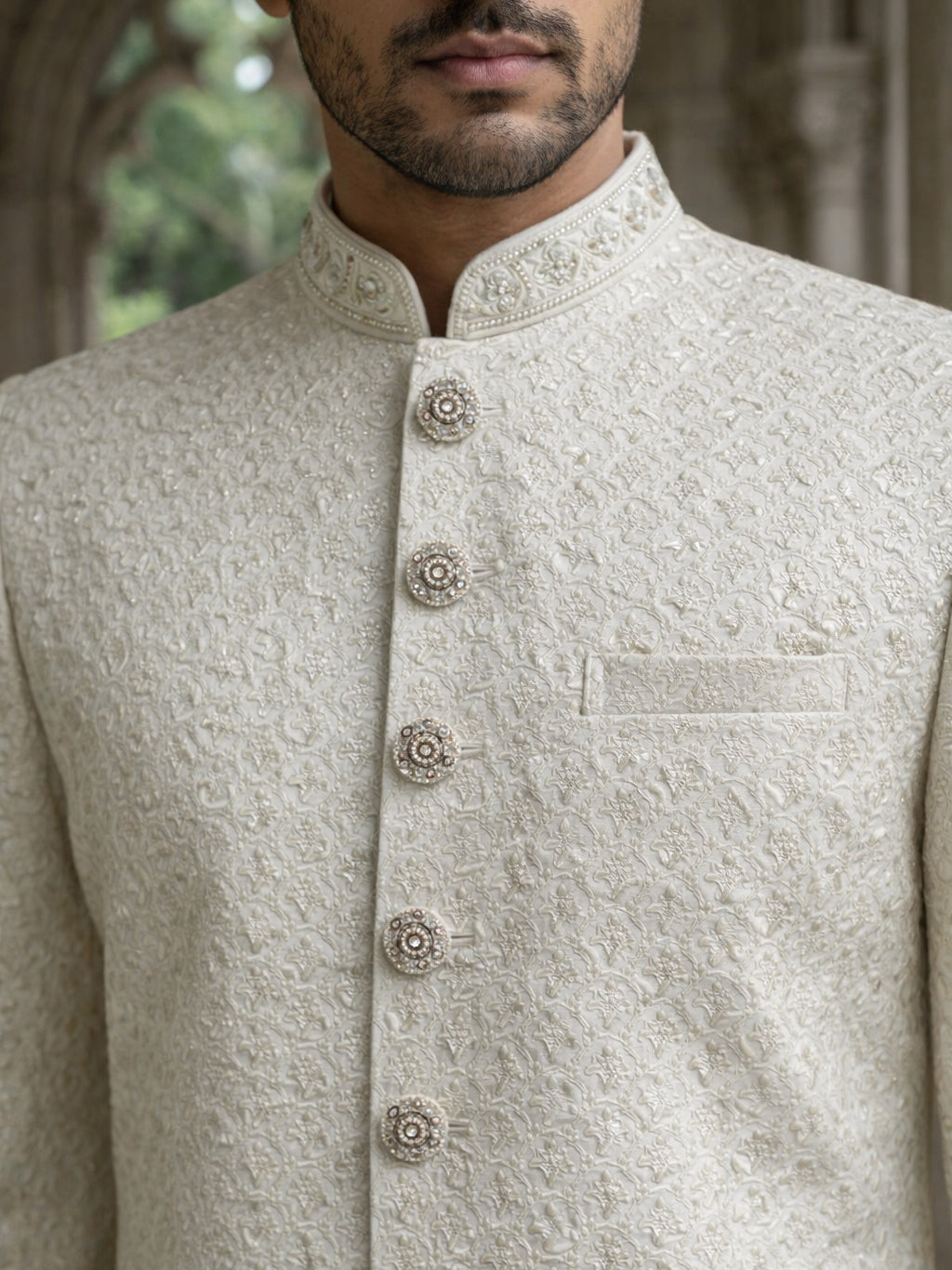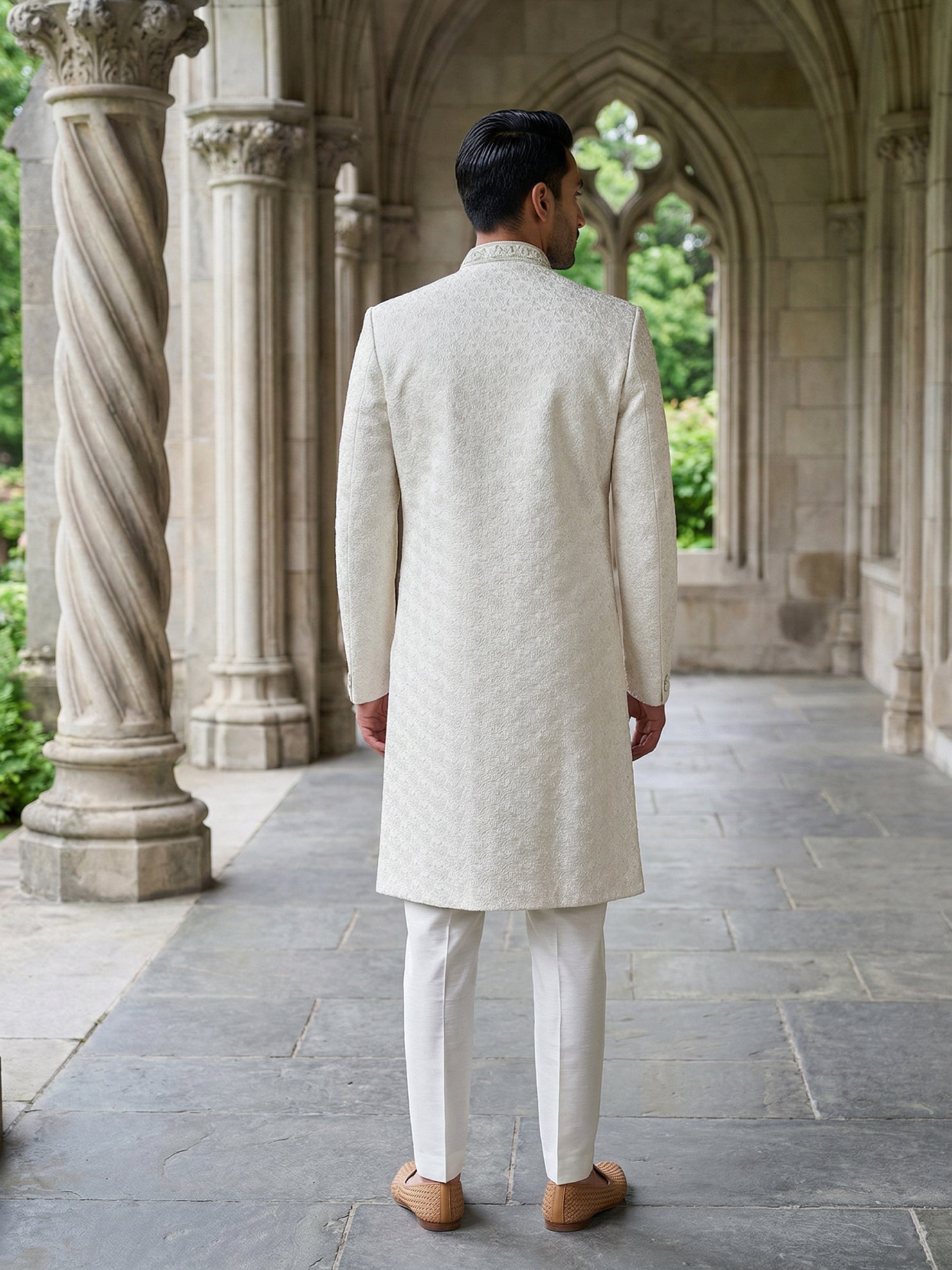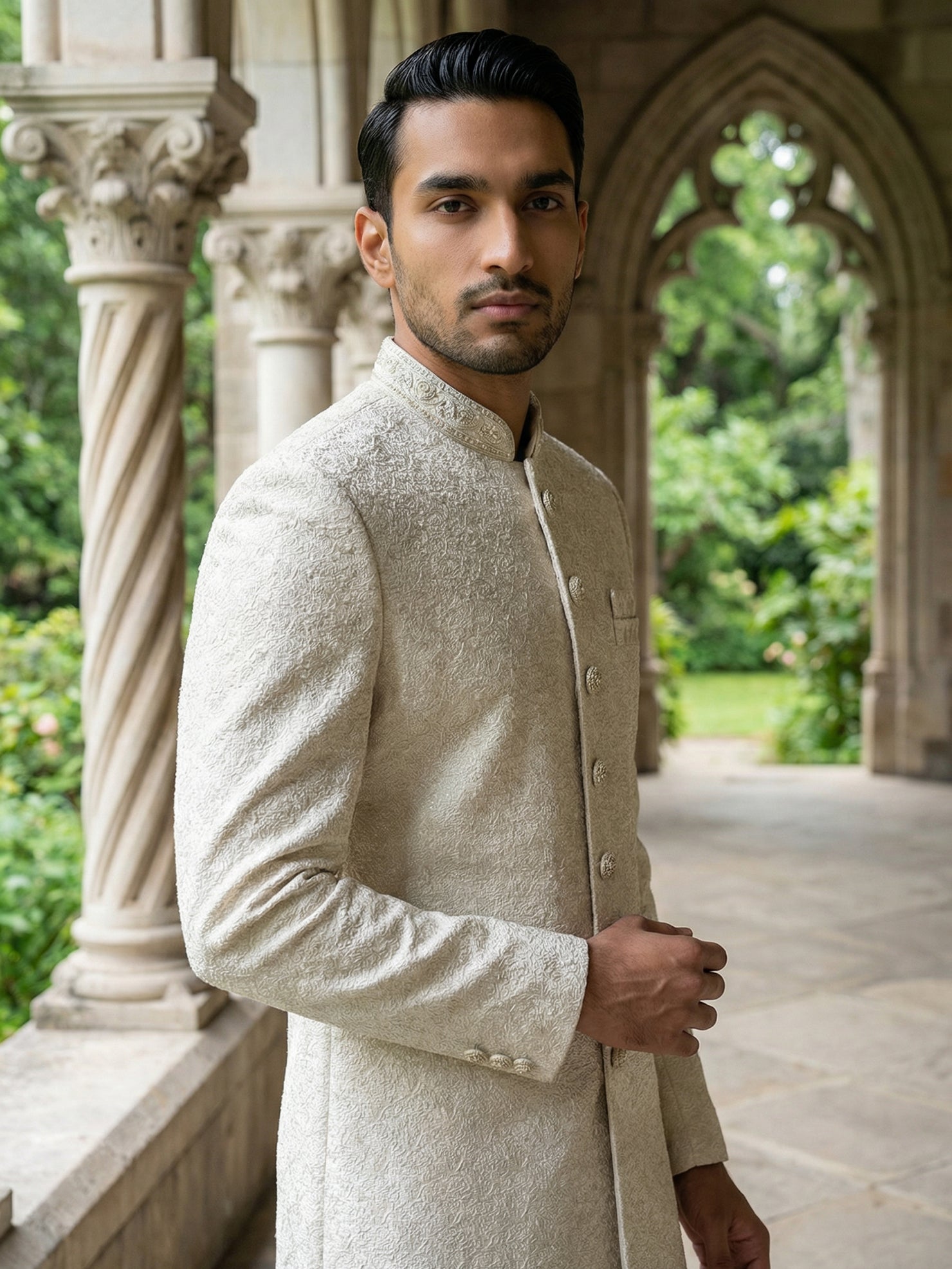 This ivory sherwani set is crafted in a premium silk-blend fabric with fine textured embroidery, offering a clean and sophisticated look. The straight-cut silhouette and structured collar create a polished finish—perfect for modern wedding dressing.
