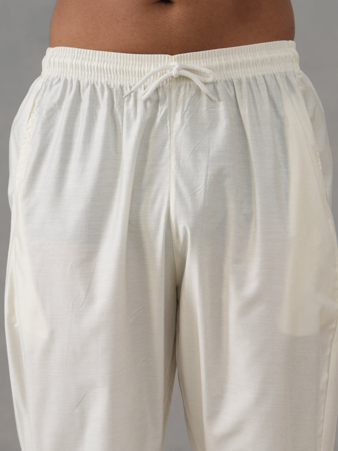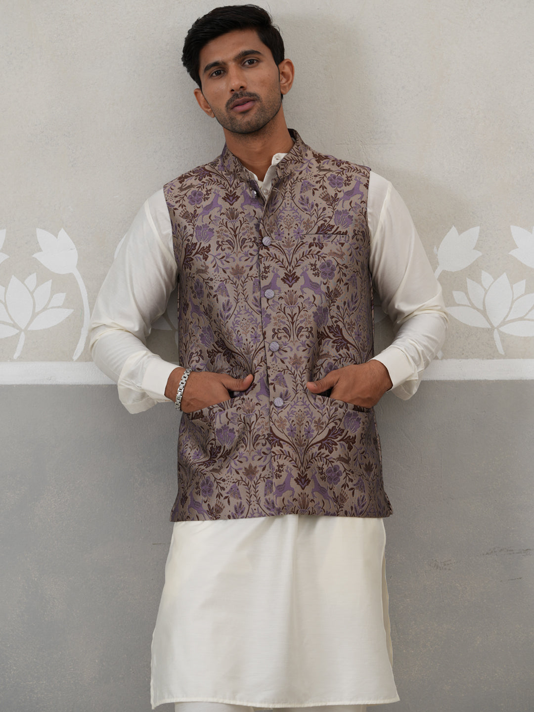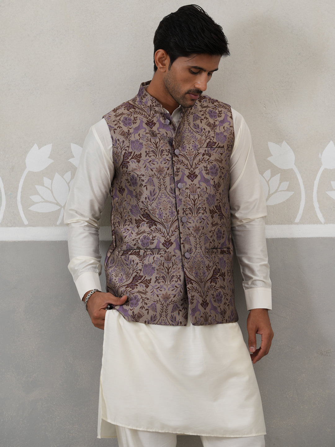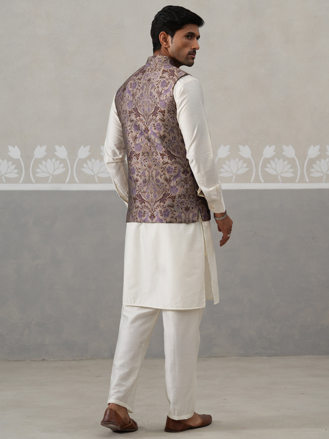 Woven Design Nehru Jacket with Cream Kurta Pyjama Set